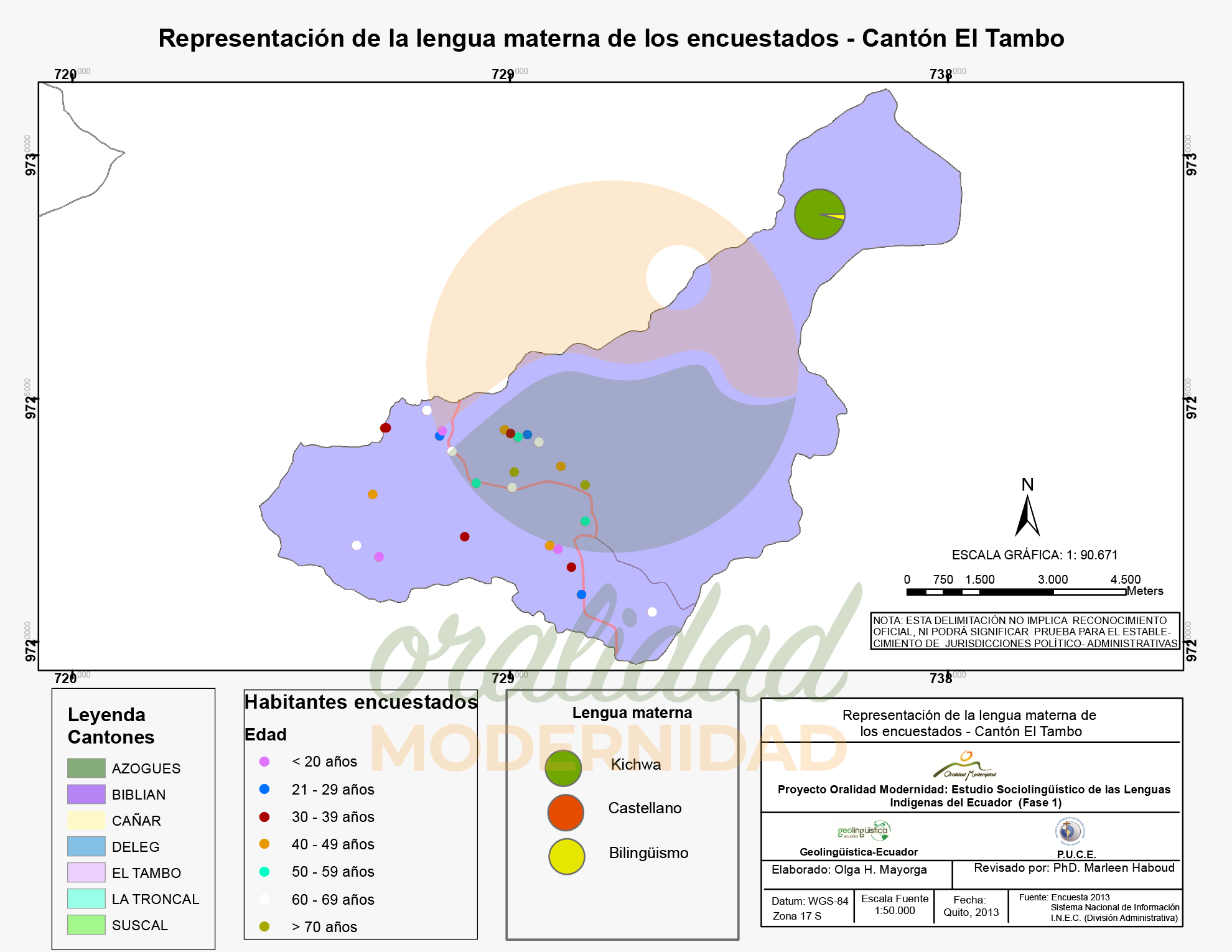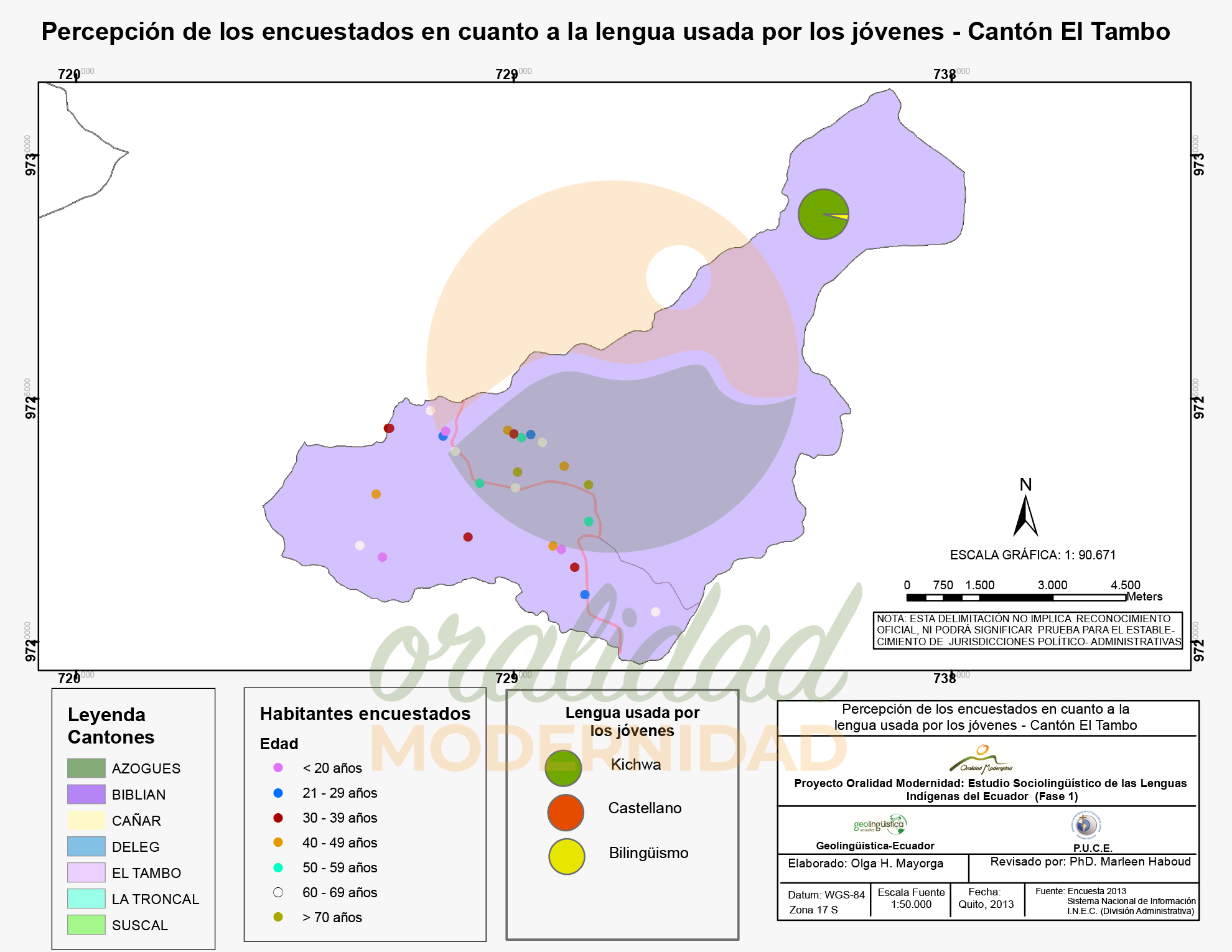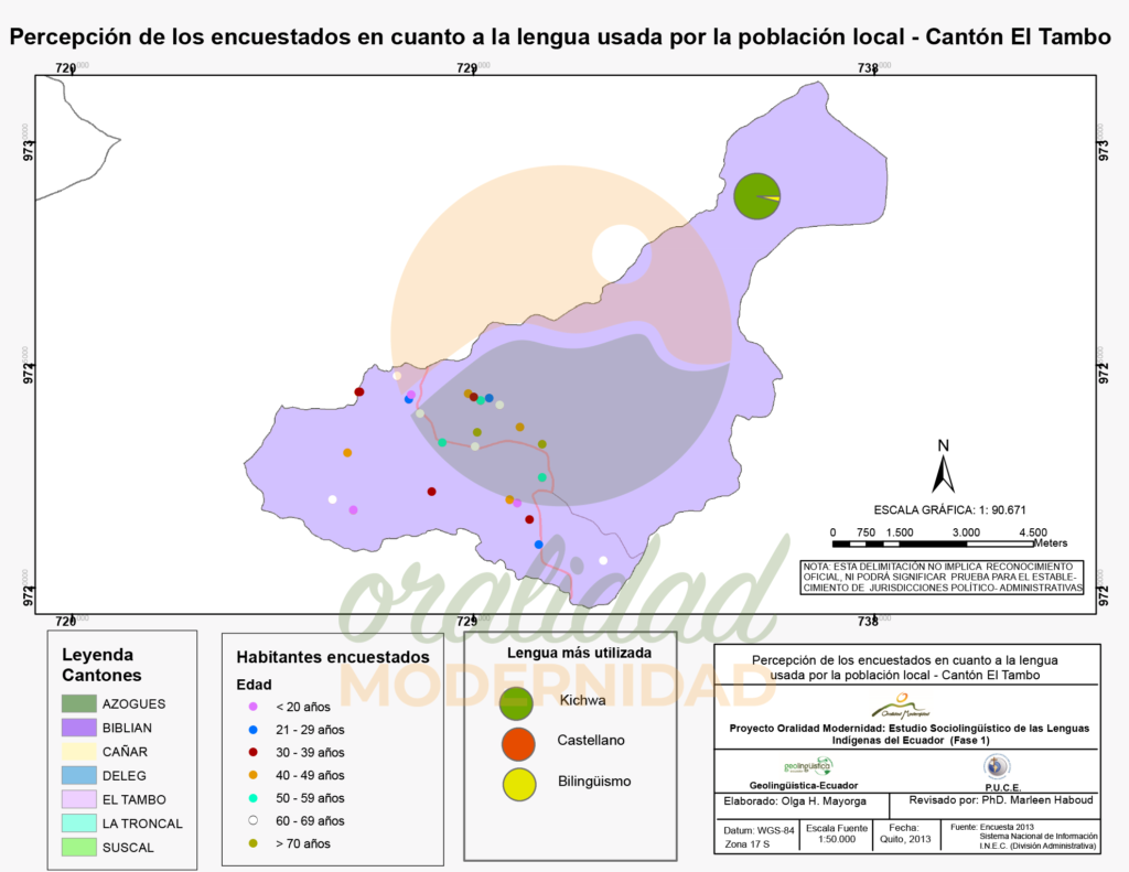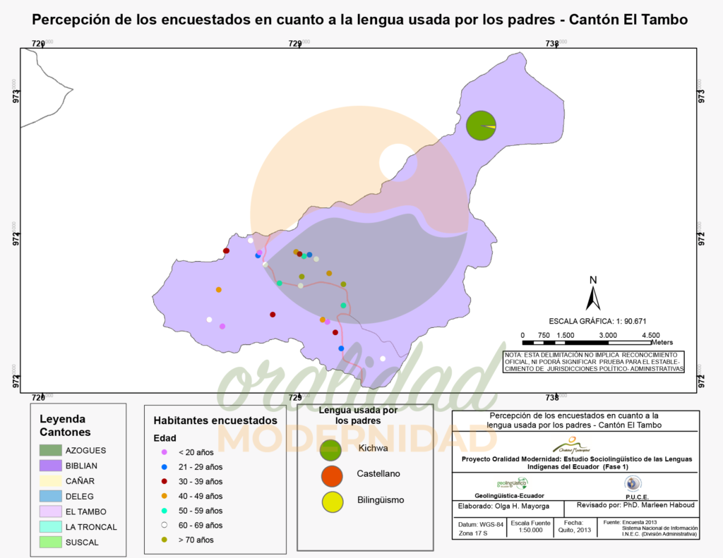 Cite así: Haboud, M. (2013). Mapa de la percepción de los encuestados en cuanto a la lengua usada por la población local en el cantón El Tambo. Programa Oralidad Modernidad/GeolingüísticaEcuador. https://oralidadmodernidad.org/canton-el-tambo/