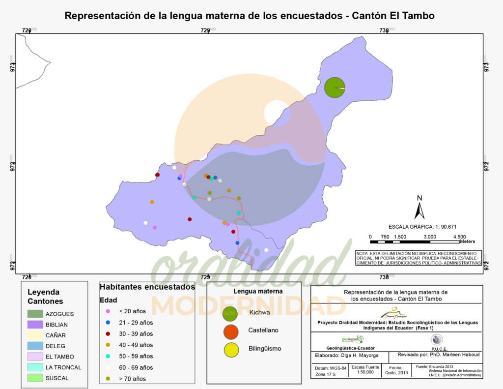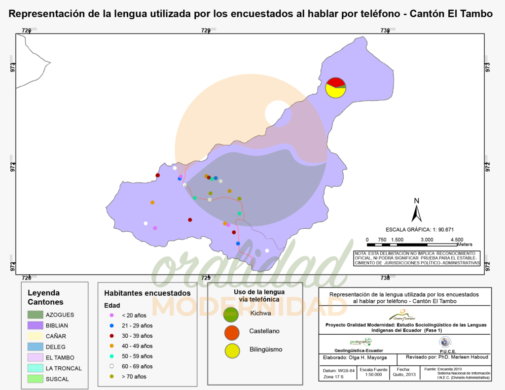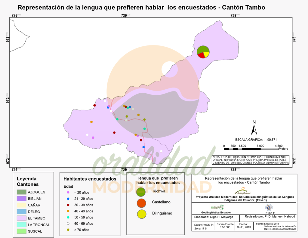 Cite así: Haboud, M. (2013). Mapa de la representación de la lengua utilizada por los encuestados al hablar por teléfono en el cantón El Tambo. Programa Oralidad Modernidad/GeolingüísticaEcuador. https://oralidadmodernidad.org/canton-el-tambo/