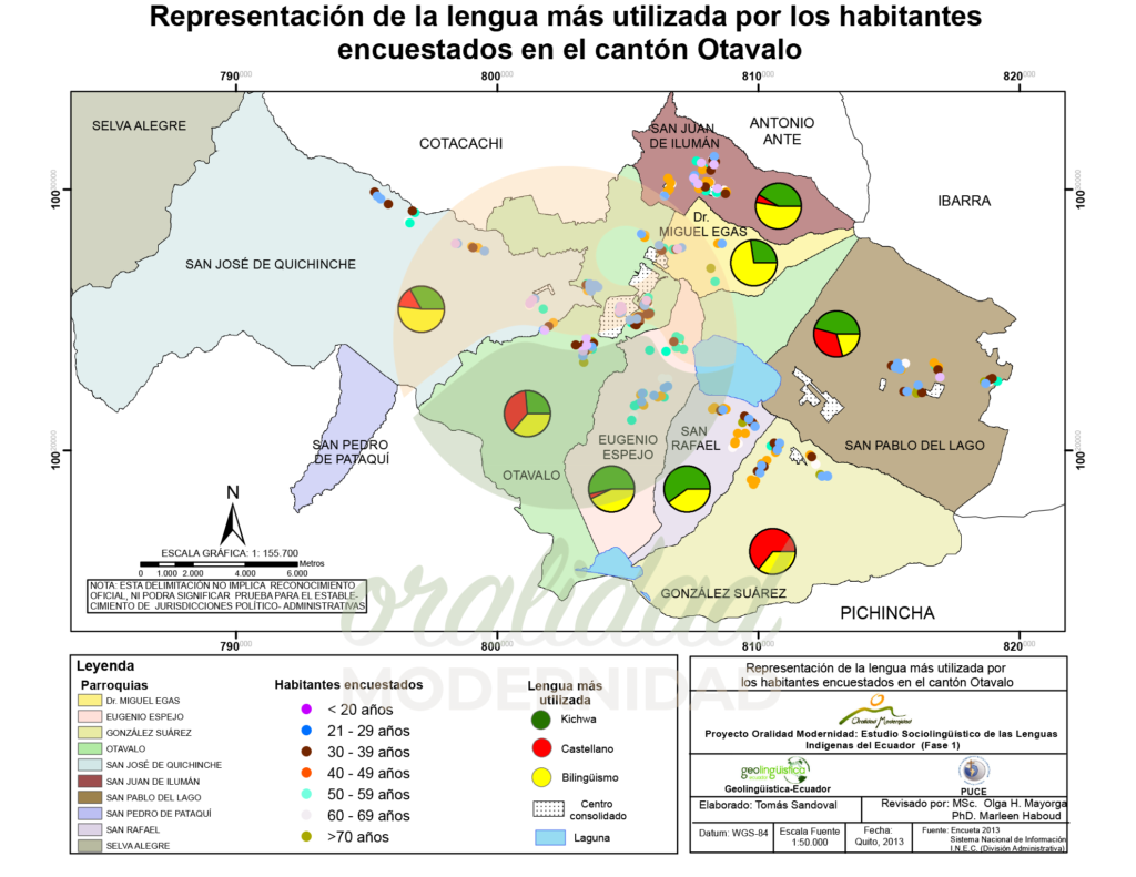 Cite: Haboud, M. (2013). Mapa de representación de la lengua más utilizada por los habitantes encuestados en el cantón Otavalo. Programa Oralidad Modernidad/GeolingüísticaEcuador. https://oralidadmodernidad.org/canton-otavalo/