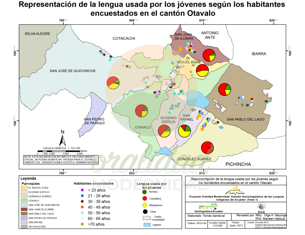 Cite: Haboud, M. (2013). Mapa de representación de la lengua usada por los jóvenes según los habitantes encuestados en el cantón Otavalo. Programa Oralidad Modernidad/GeolingüísticaEcuador. https://oralidadmodernidad.org/canton-otavalo/
