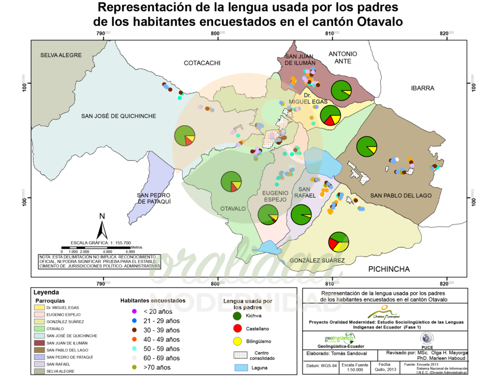 Cite: Haboud, M. (2013). Mapa de representación de la lengua usada por los padres de los habitantes encuestados en el cantón Otavalo. Programa Oralidad Modernidad/GeolingüísticaEcuador. https://oralidadmodernidad.org/canton-otavalo/