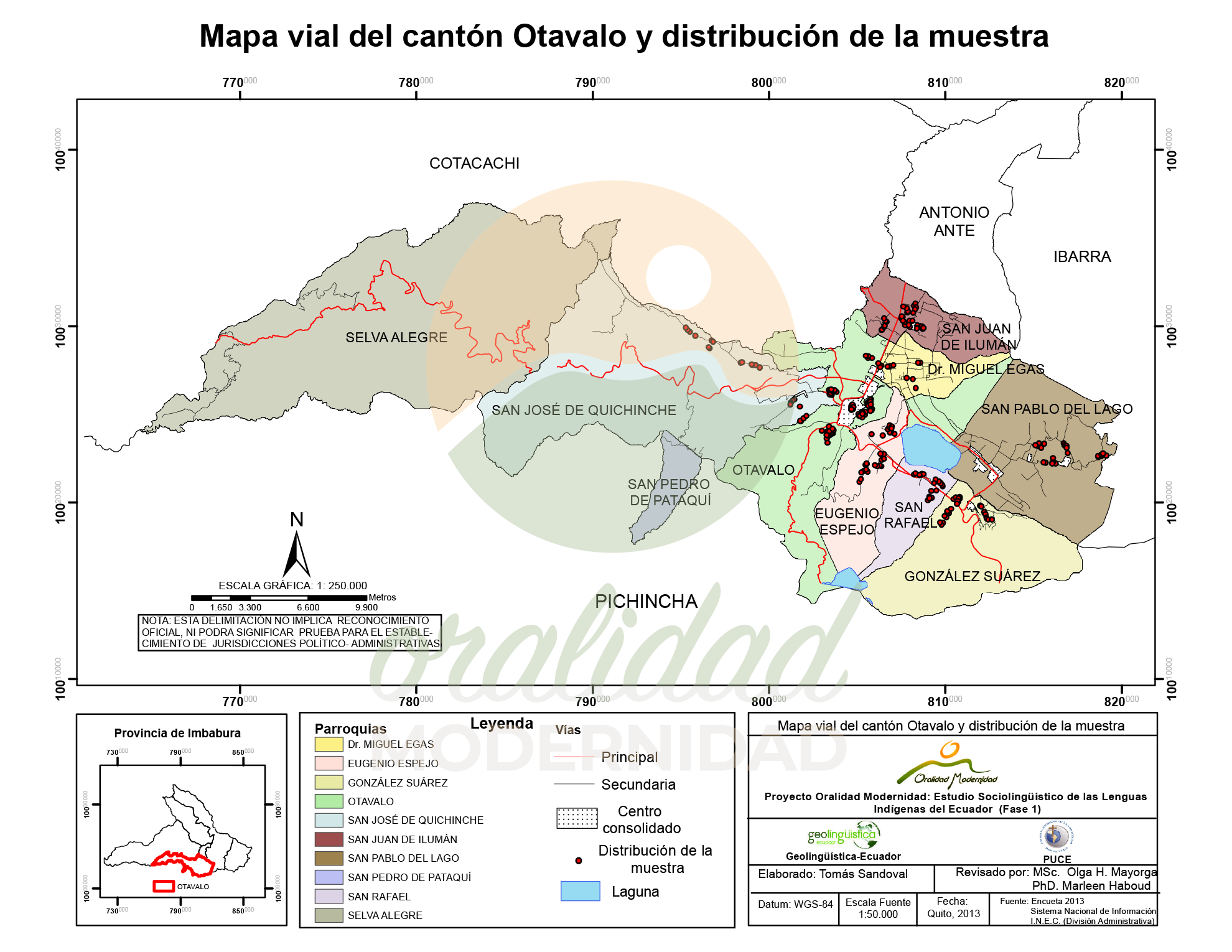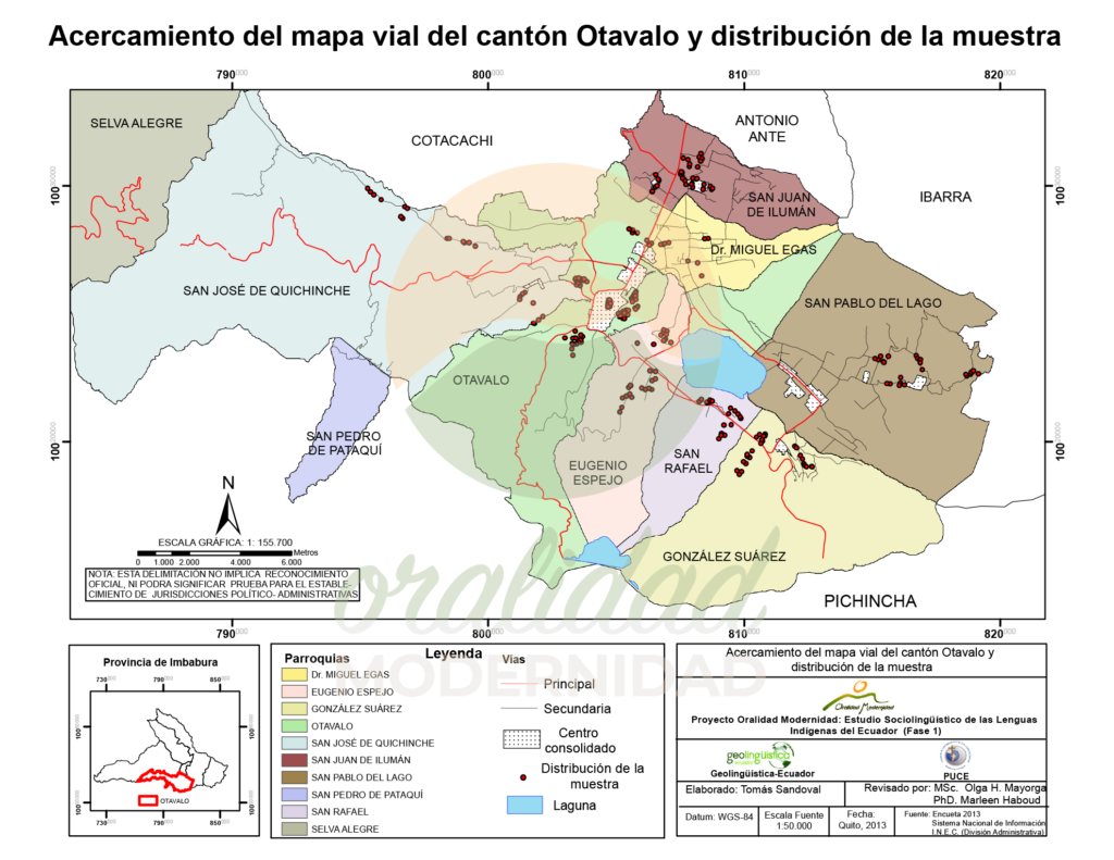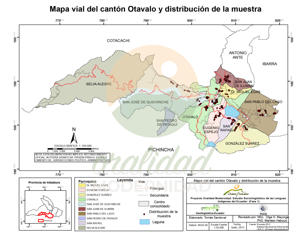 Cite: Haboud, M. (2013). Acercamiento del mapa vial del cantón Otavalo y distribución de la muestra. Programa Oralidad Modernidad/ GeolingüísticaEcuador. https://oralidadmodernidad.org/canton-otavalo/