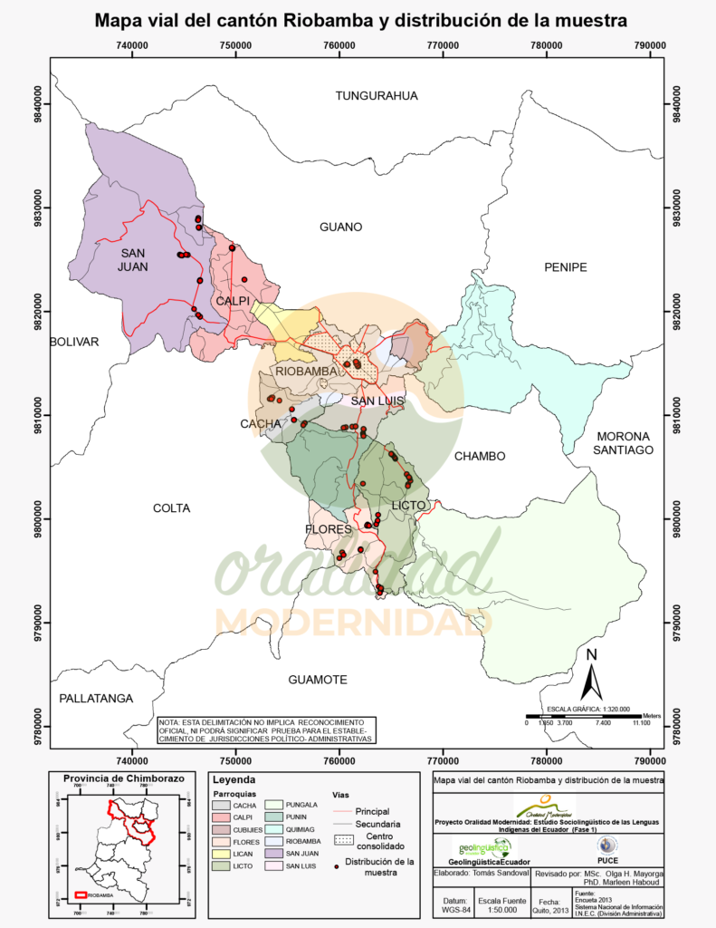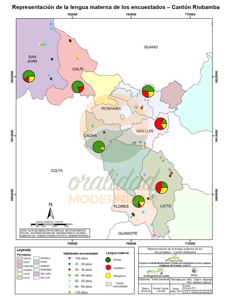 Cite: Haboud, M. (2013). Mapa de la percepción de los encuestados en cuanto a la lengua usada por los jóvenes en el cantón Riobamba. Programa Oralidad Modernidad/GeolingüísticaEcuador. https://oralidadmodernidad.org/canton-riobamba/