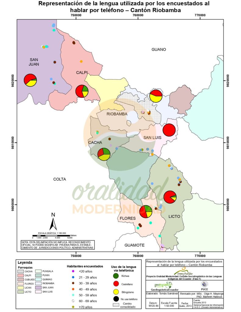 Cite: Haboud, M. (2013). Mapa de la representación de la lengua utilizada por los encuestados al hablar por teléfono en el cantón Riobamba. Programa Oralidad Modernidad/GeolingüísticaEcuador. https://oralidadmodernidad.org/canton-riobamba/