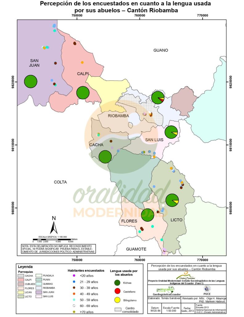 Cite: Haboud, M. (2013). Mapa de la percepción de los encuestados en cuanto a la lengua usada por sus abuelos en el cantón Riobamba. Programa Oralidad Modernidad/GeolingüísticaEcuador. https://oralidadmodernidad.org/canton-riobamba/