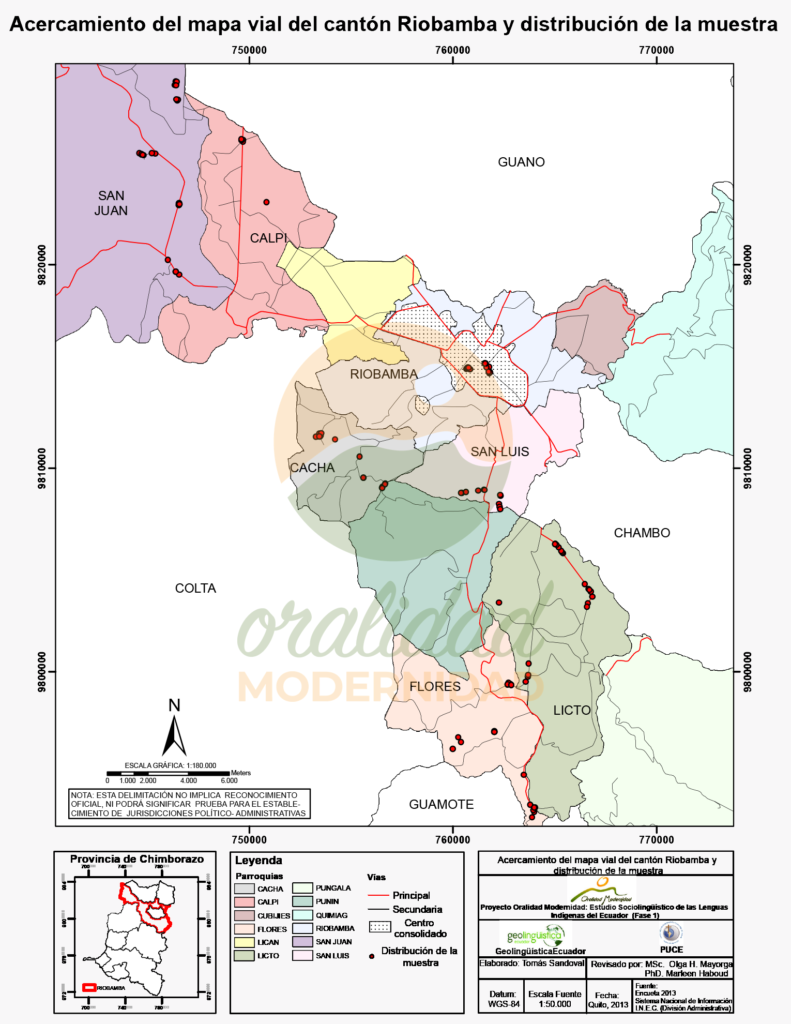 Cite: Haboud, M. (2013). Acercamiento del mapa vial del cantón Riobamba y distribución de la muestra. Programa Oralidad Modernidad/GeolingüísticaEcuador. https://oralidadmodernidad.org/canton-riobamba/