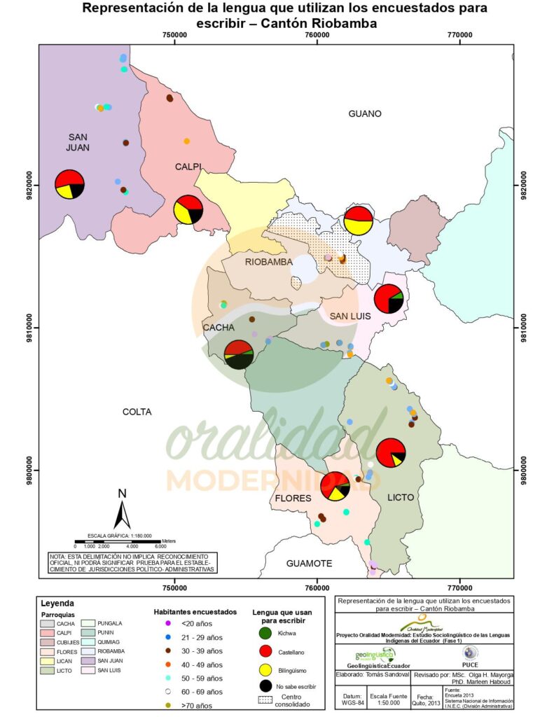 Cite: Haboud, M. (2013). Mapa de la representación de la lengua que utilizan los encuestados para escribir en el cantón Riobamba. Programa Oralidad Modernidad/GeolingüísticaEcuador. https://oralidadmodernidad.org/canton-riobamba/