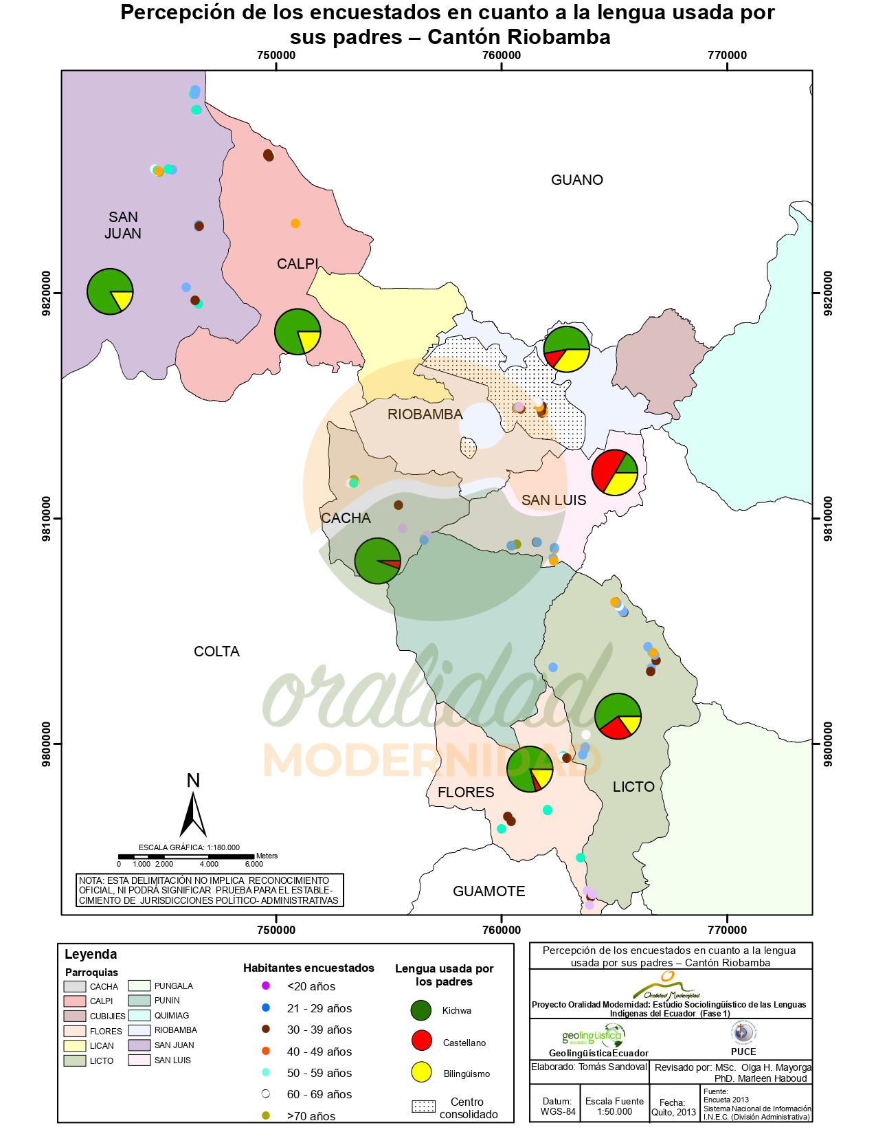 Cite: Haboud, M. (2013). Mapa de la percepción de los encuestados en cuanto a la lengua usada por sus padres en el cantón Riobamba. Programa Oralidad Modernidad/GeolingüísticaEcuador. https://oralidadmodernidad.org/canton-riobamba/