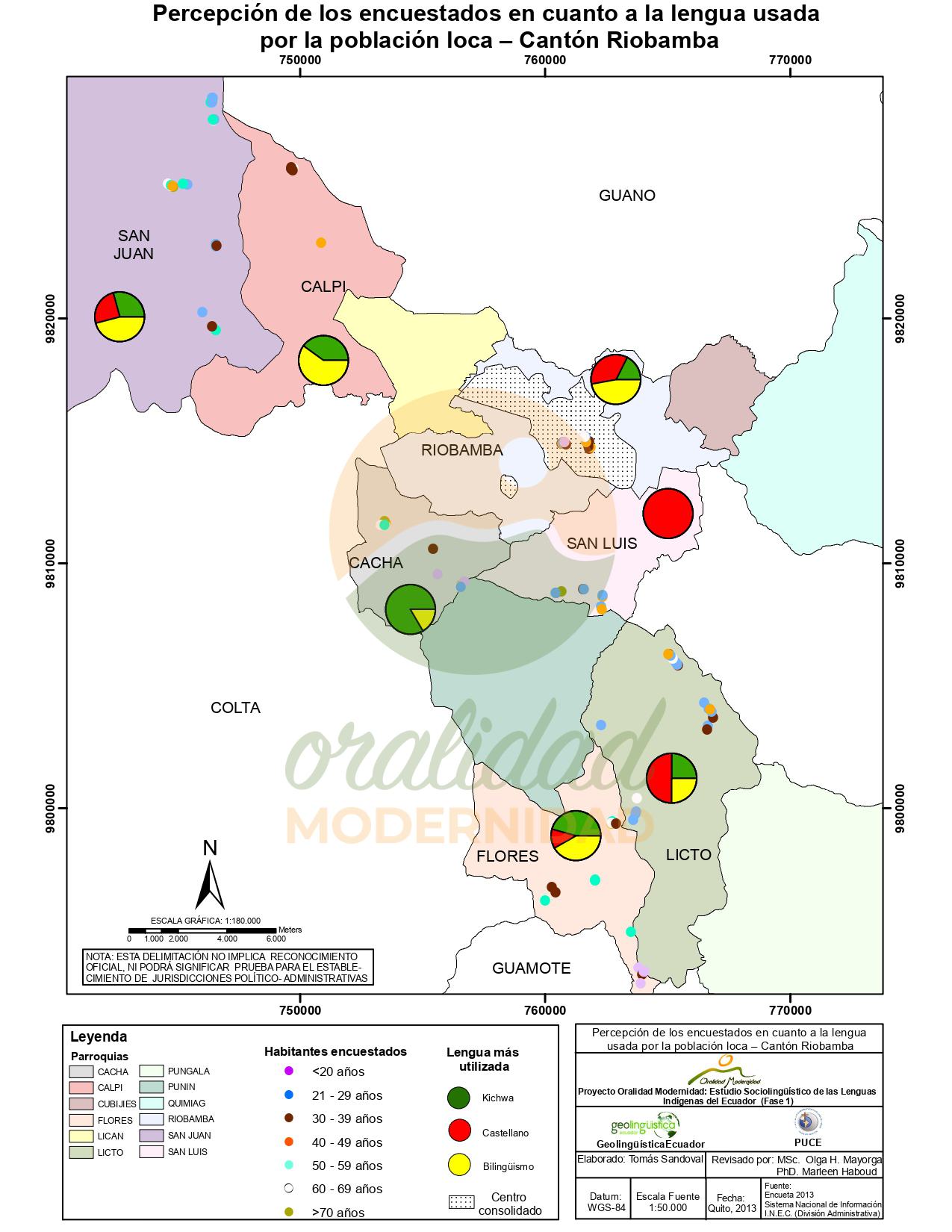 Cite: Haboud, M. (2013). Mapa de la percepción de los encuestados en cuanto a la lengua usada por la población local en el cantón Riobamba. Programa Oralidad Modernidad/GeolingüísticaEcuador. https://oralidadmodernidad.org/canton-riobamba/
