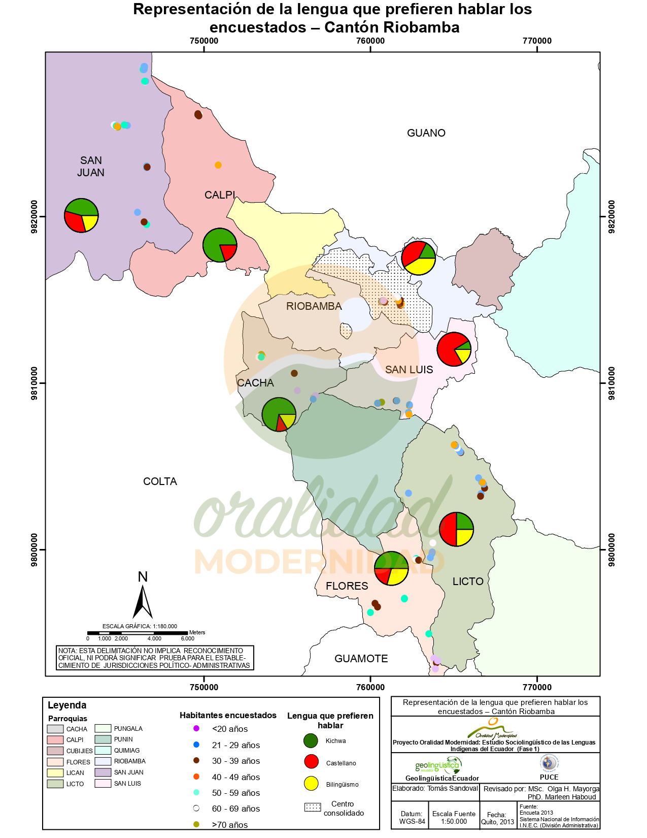 Cite: Haboud, M. (2013). Mapa de la percepción de los encuestados en cuanto a la lengua usada por los jóvenes en el cantón Riobamba. Programa Oralidad Modernidad/GeolingüísticaEcuador. https://oralidadmodernidad.org/canton-riobamba/