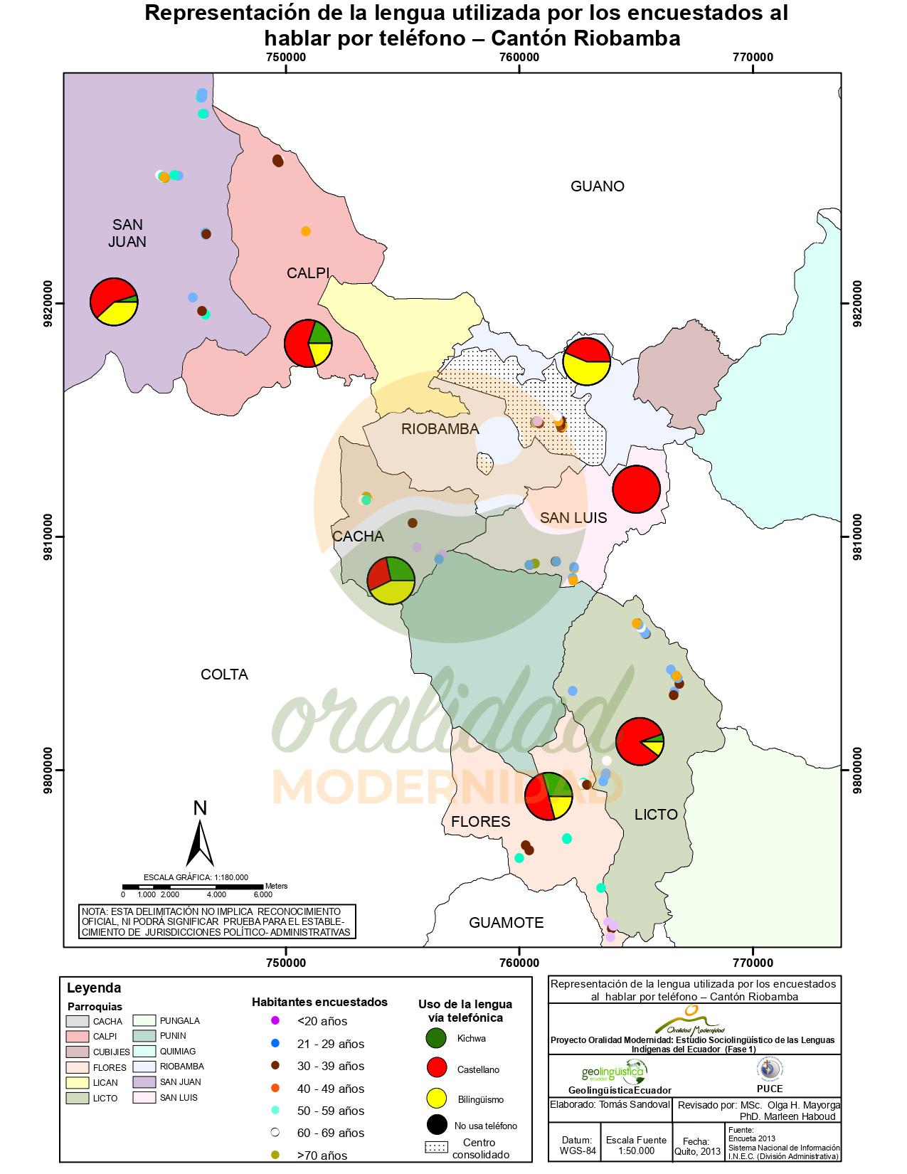 Cite: Haboud, M. (2013). Mapa de la representación de la lengua utilizada por los encuestados al hablar por teléfono en el cantón Riobamba. Programa Oralidad Modernidad/GeolingüísticaEcuador. https://oralidadmodernidad.org/canton-riobamba/