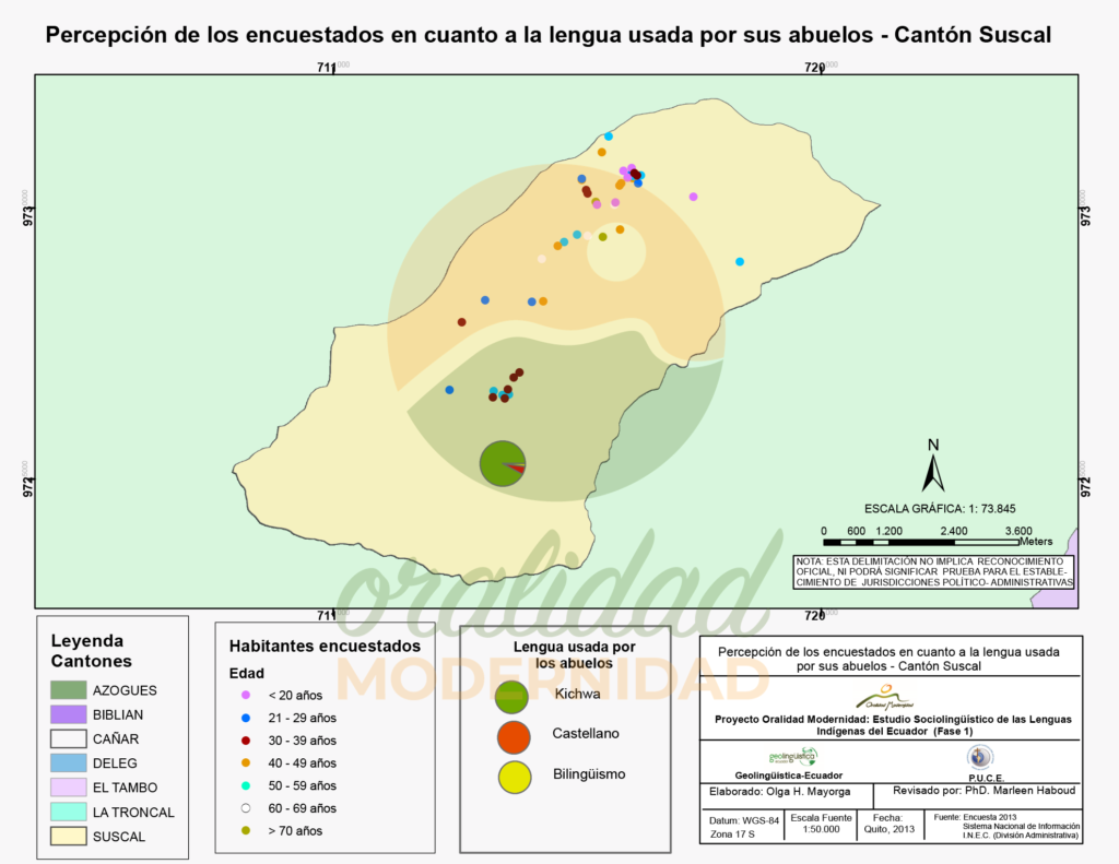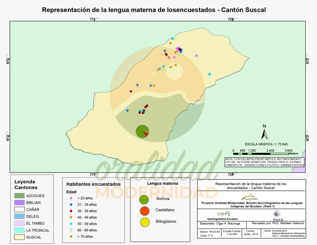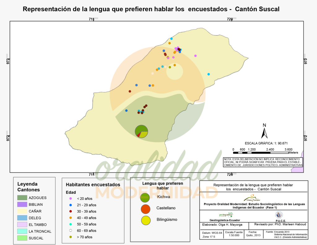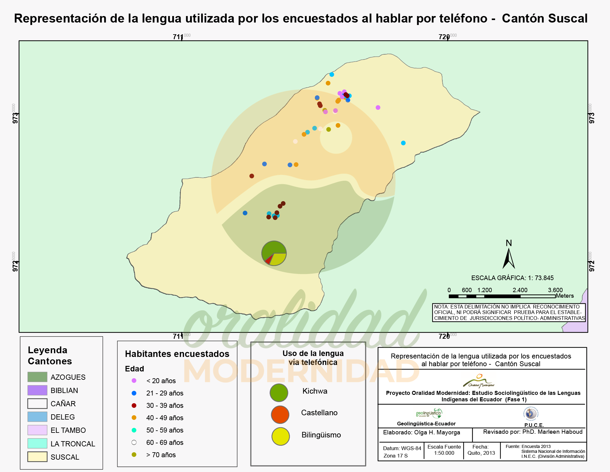Cite así: Haboud, M. (2013). Mapa de la representación de la lengua utilizada por los encuestados al hablar por teléfono en el cantón Suscal. Programa Oralidad Modernidad/GeolingüísticaEcuador. https://oralidadmodernidad.org/canton-suscal/