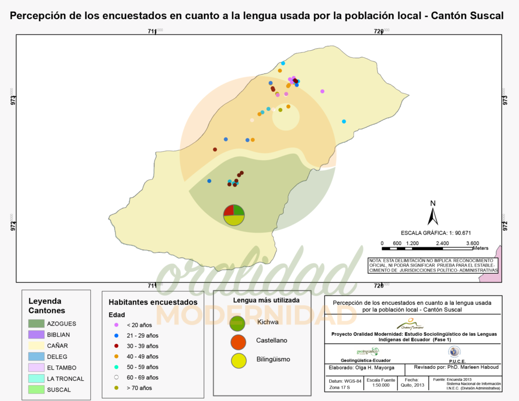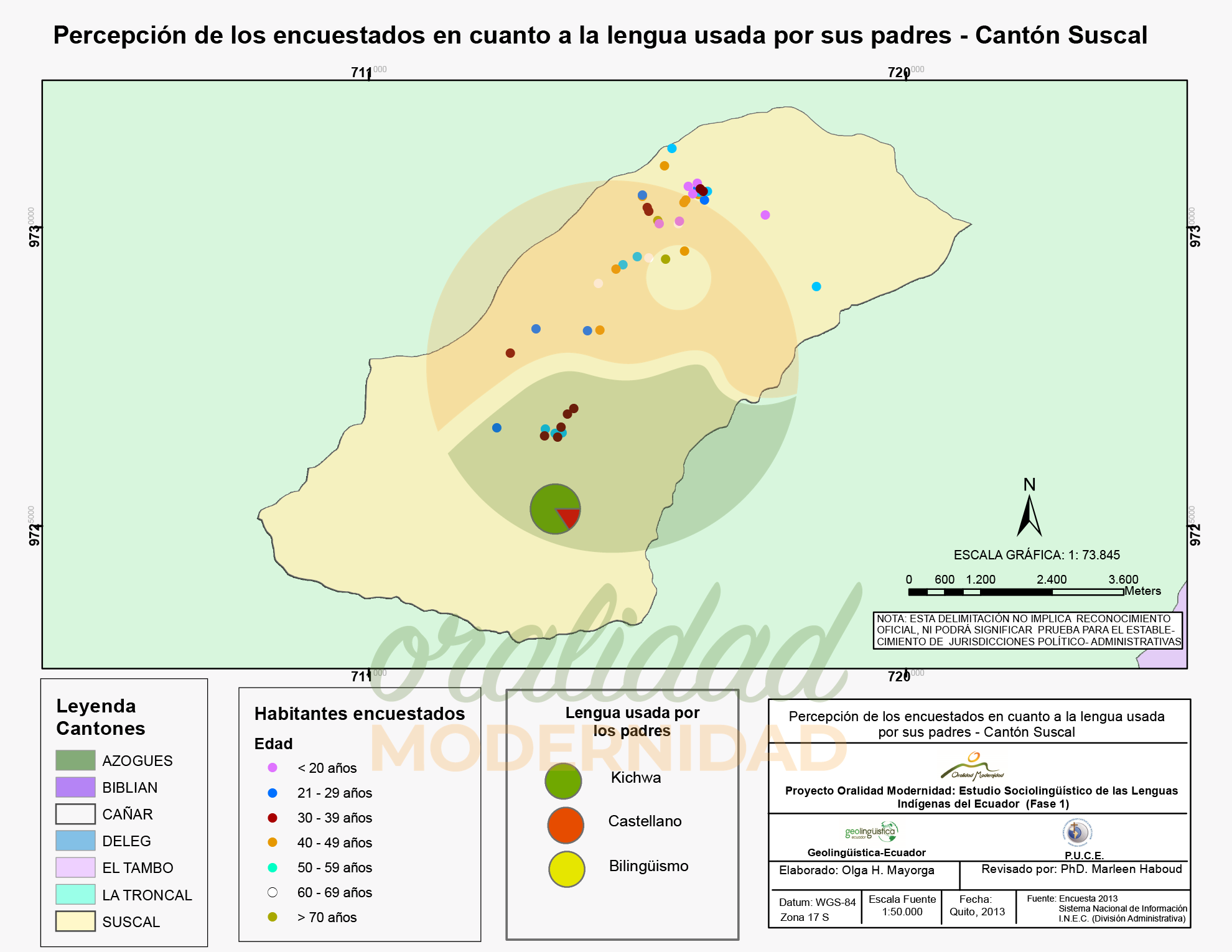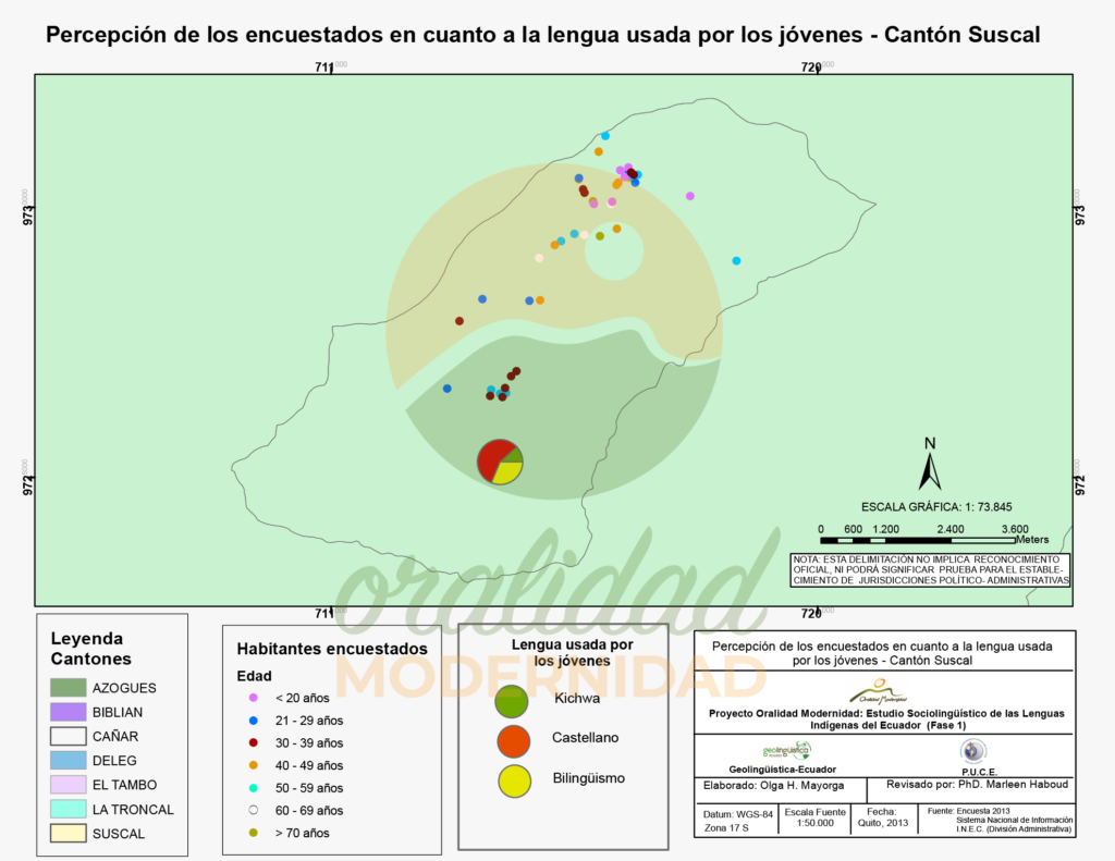 Cite así: Haboud, M. (2013). Mapa de la percepción de los encuestados en cuanto a la lengua usada por los jóvenes en el cantón Suscal. Programa Oralidad Modernidad/GeolingüísticaEcuador. https://oralidadmodernidad.org/canton-suscal/