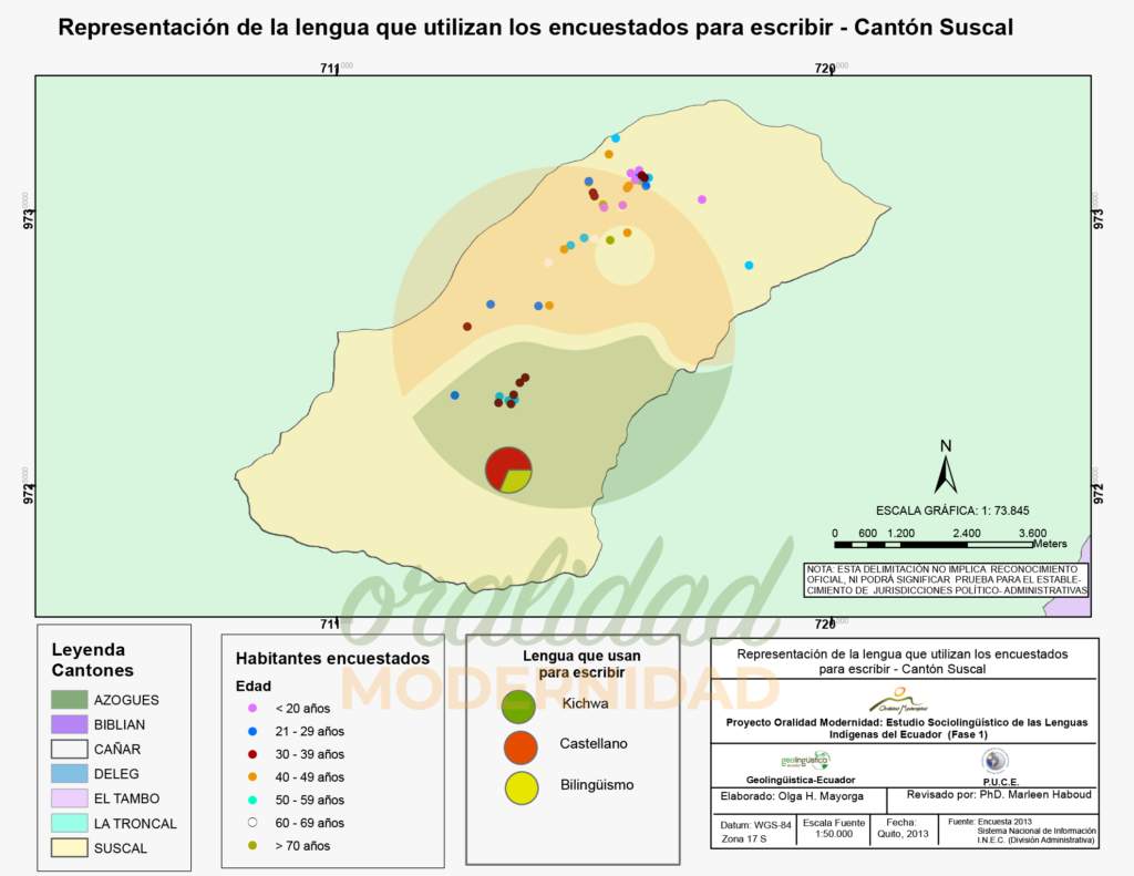 Cite así: Haboud, M. (2013). Mapa de la representación de la lengua que utilizan los encuestados para escribir en el cantón Suscal. Programa Oralidad Modernidad/GeolingüísticaEcuador. https://oralidadmodernidad.org/canton-suscal/