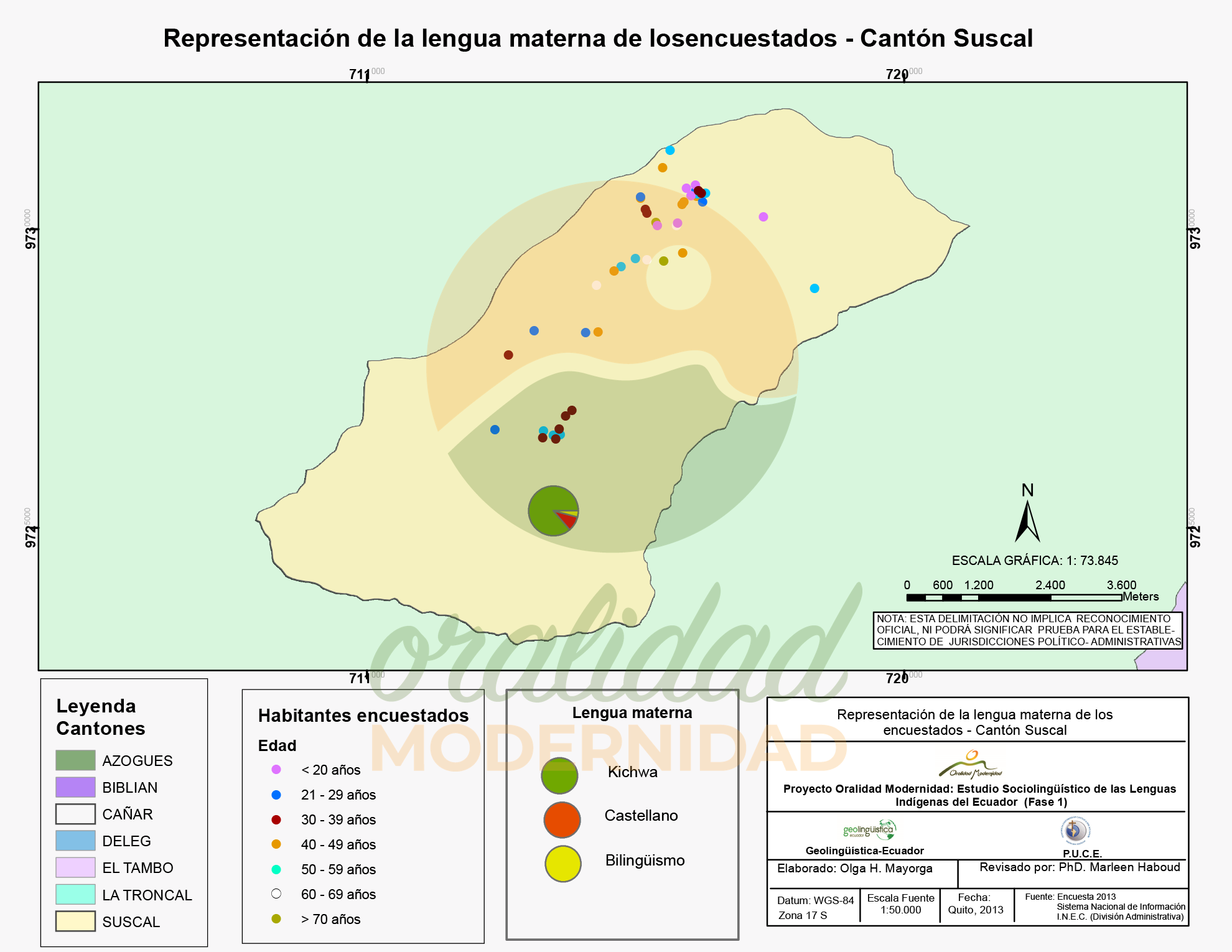 Cite así: Haboud, M. (2013). Mapa de la representación de la lengua materna de los encuestados en el cantón Suscal. Programa Oralidad Modernidad/GeolingüísticaEcuador. https://oralidadmodernidad.org/canton-suscal/