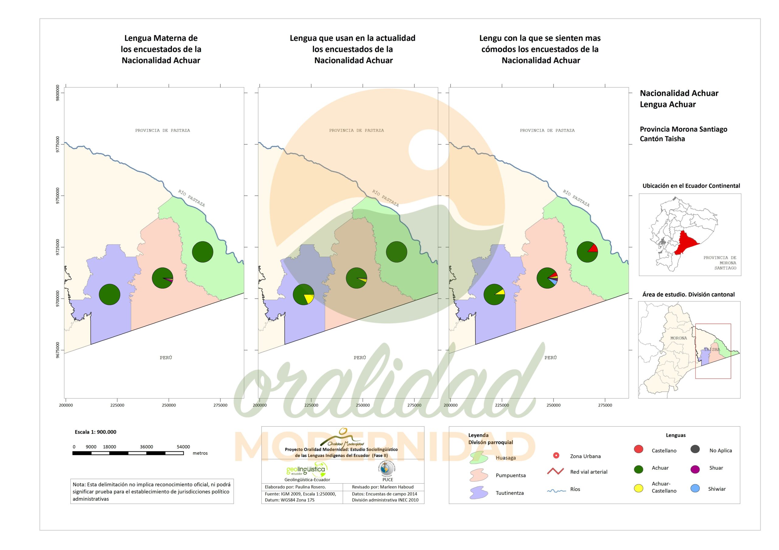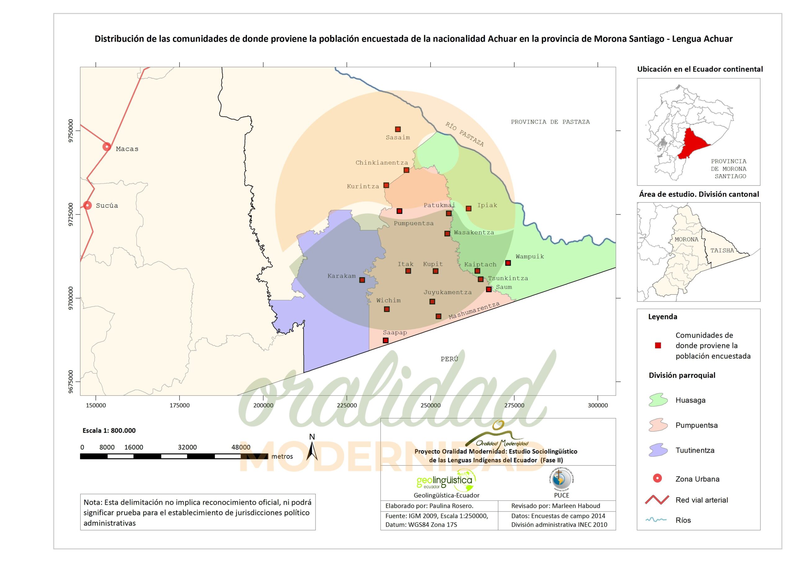 Cite: Haboud, M. (2014). Mapa de lengua materna preferencial de la nacionalidad Achuar en la provincia de Morona Santiago – Lengua Achuar. Programa Oralidad Modernidad/GeolingüísticaEcuador. https://oralidadmodernidad.org/cartografia-achuar/
