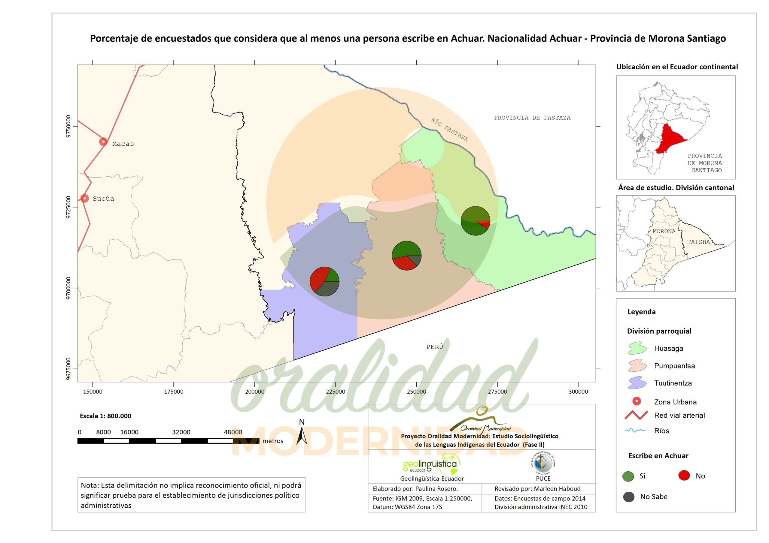 Cite: Haboud, M. (2014). Mapa de percepción de los encuestados que considera que al menos una persona escribe en Achuar de la nacionalidad Achuar en la provincia de Morona Santiago – Lengua Achuar. Programa Oralidad Modernidad/GeolingüísticaEcuador. https://oralidadmodernidad.org/cartografia-achuar/