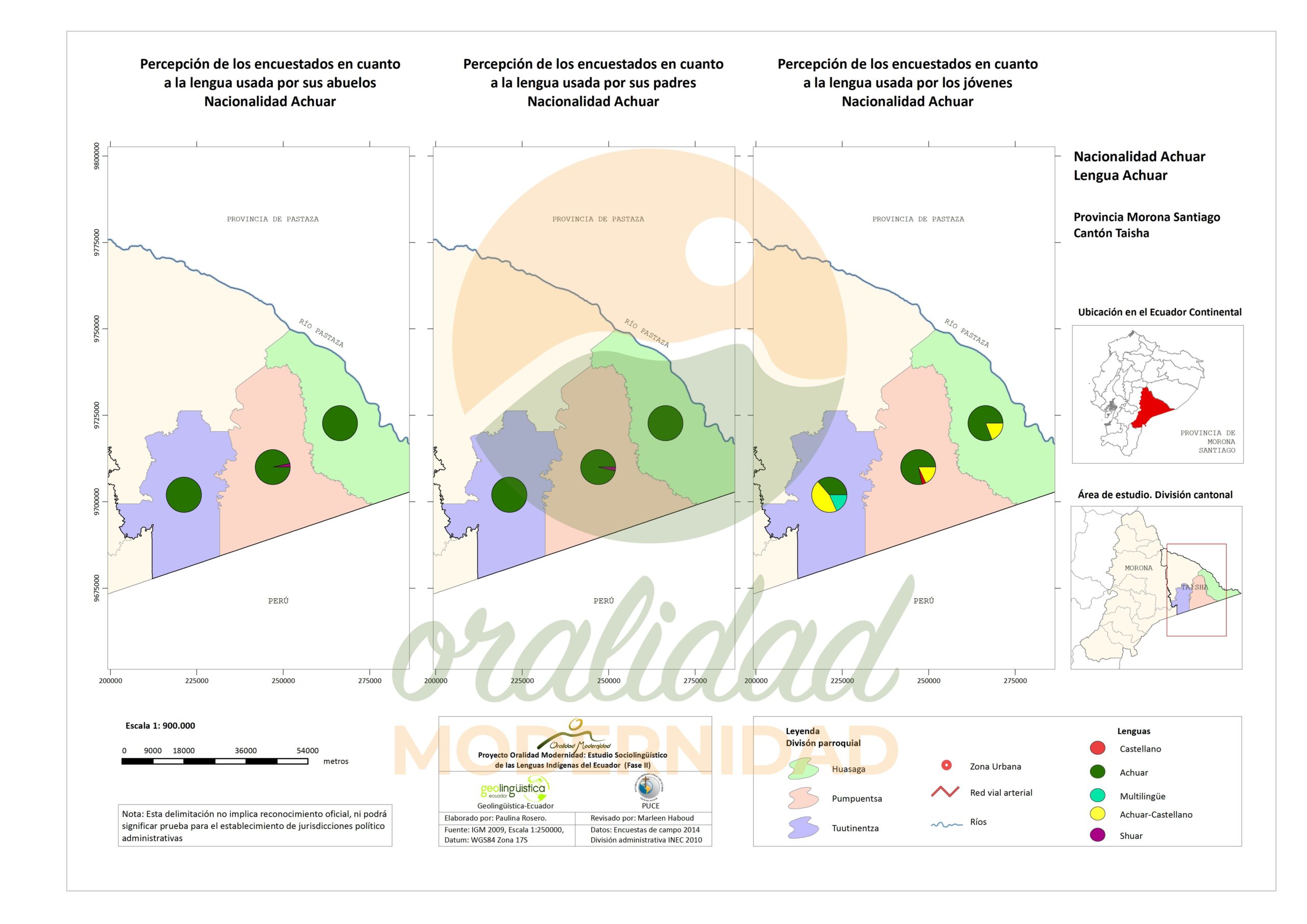 Cite: Haboud, M. (2014). Mapa de percepción de los encuestados en cuanto a la lengua usada por abuelos, padres y jóvenes de la nacionalidad Achuar en la provincia de Morona Santiago – Lengua Achuar. Programa Oralidad Modernidad/GeolingüísticaEcuador. https://oralidadmodernidad.org/cartografia-achuar/