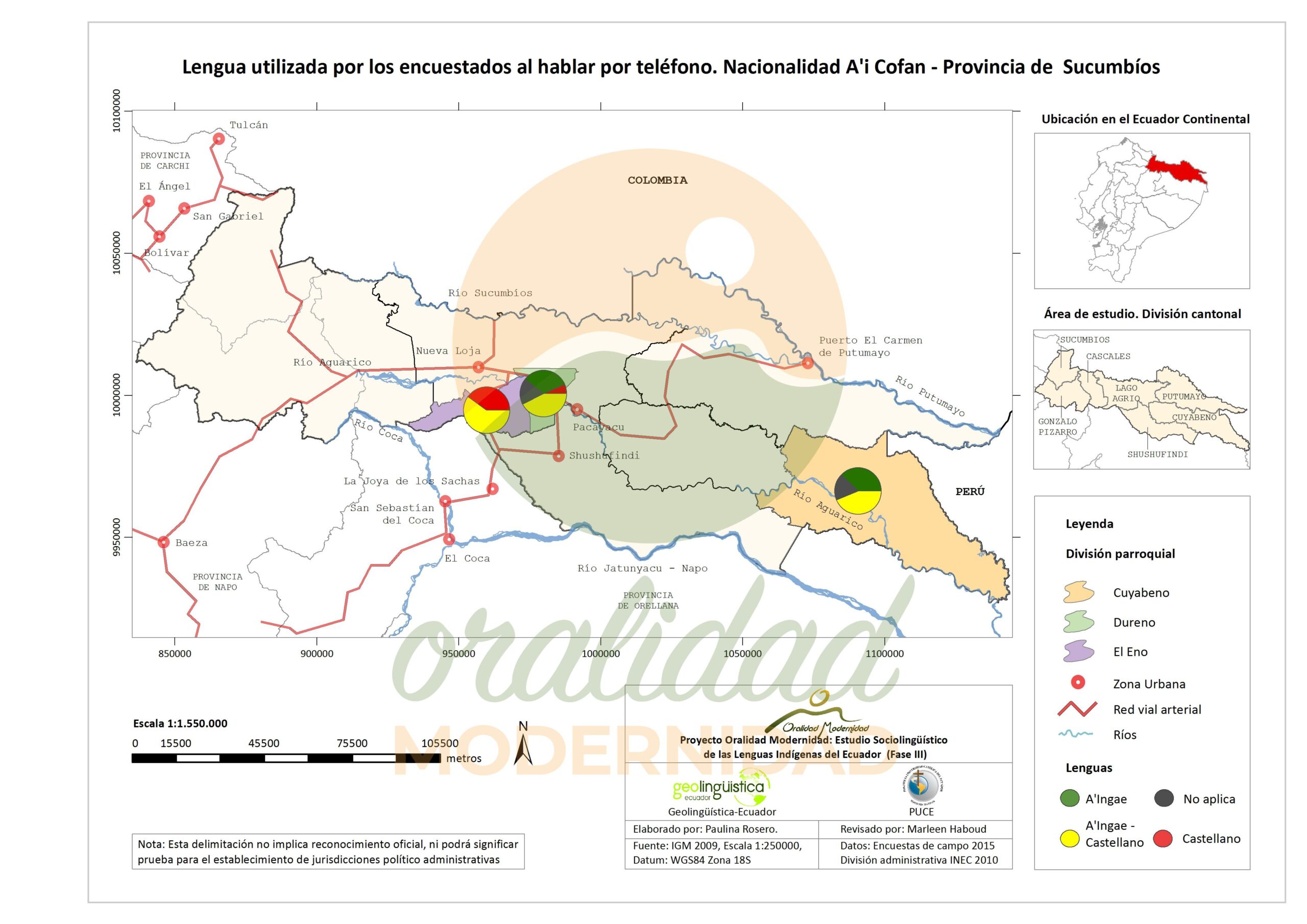 Cite: Haboud, M. (2014). Mapa de la lengua hablada por los encuestados al hablar por teléfono de la nacionalidad A’iCofan en la provincia de Sucumbíos – Lengua A’Ingae. Programa Oralidad Modernidad/GeolingüísticaEcuador.https://oralidadmodernidad.org/cartografia-aingae/