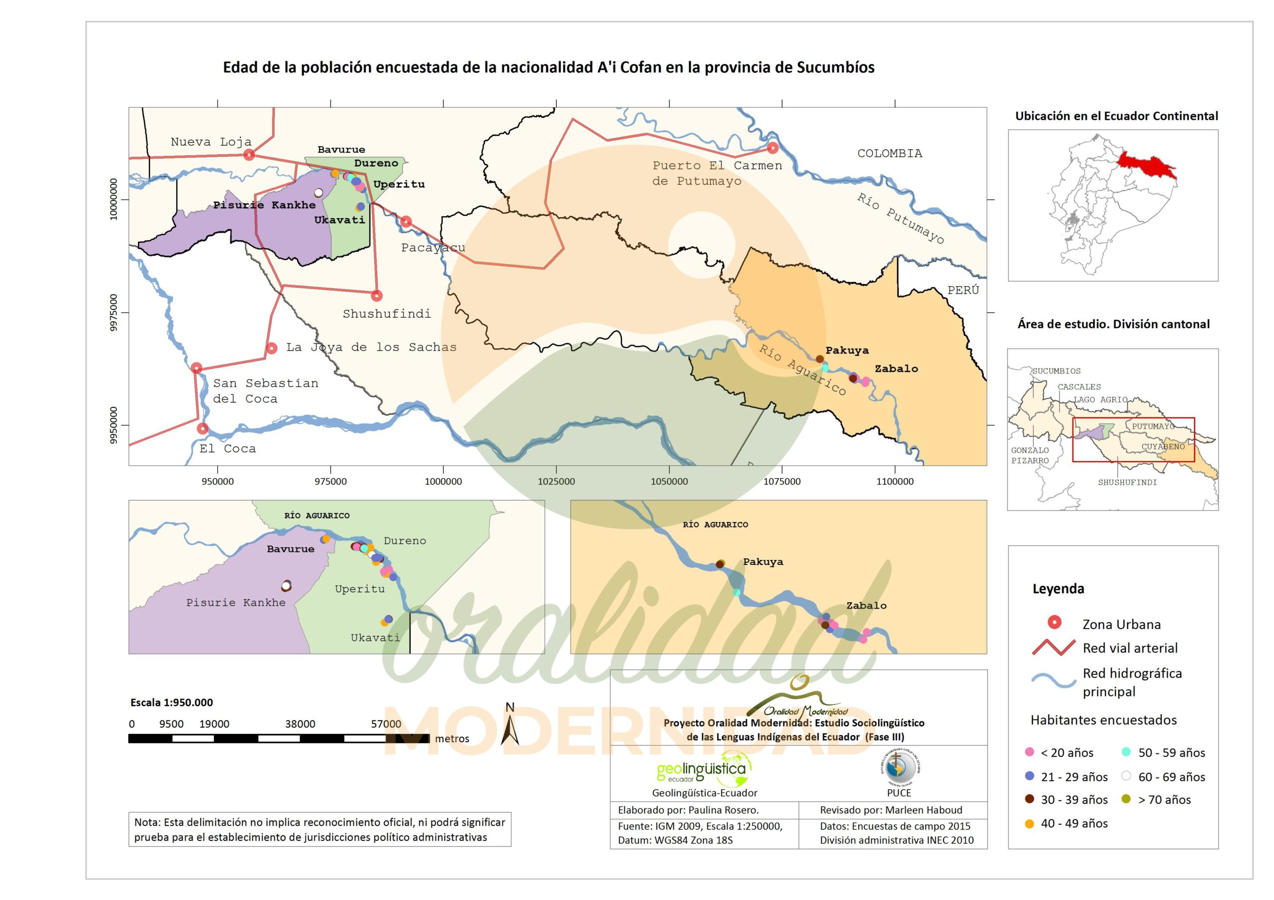Cite: Haboud, M. (2014). Mapa de edad de la población de la nacionalidad A’iCofan en la provincia de Sucumbíos – Lengua A’Ingae. Programa Oralidad Modernidad/GeolingüísticaEcuador.https://oralidadmodernidad.org/cartografia-aingae/