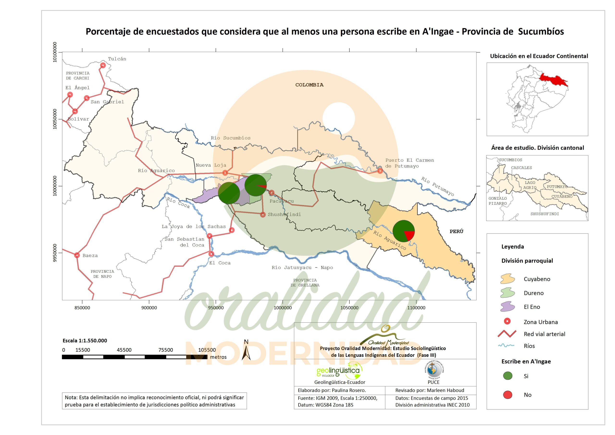 Cite: Haboud, M. (2014). Mapa de porcentaje de encuestados que considera que al menos una persona escribe en A’Ingae en la provincia de Sucumbíos – Lengua A’Ingae. Programa Oralidad Modernidad/GeolingüísticaEcuador.https://oralidadmodernidad.org/cartografia-aingae/