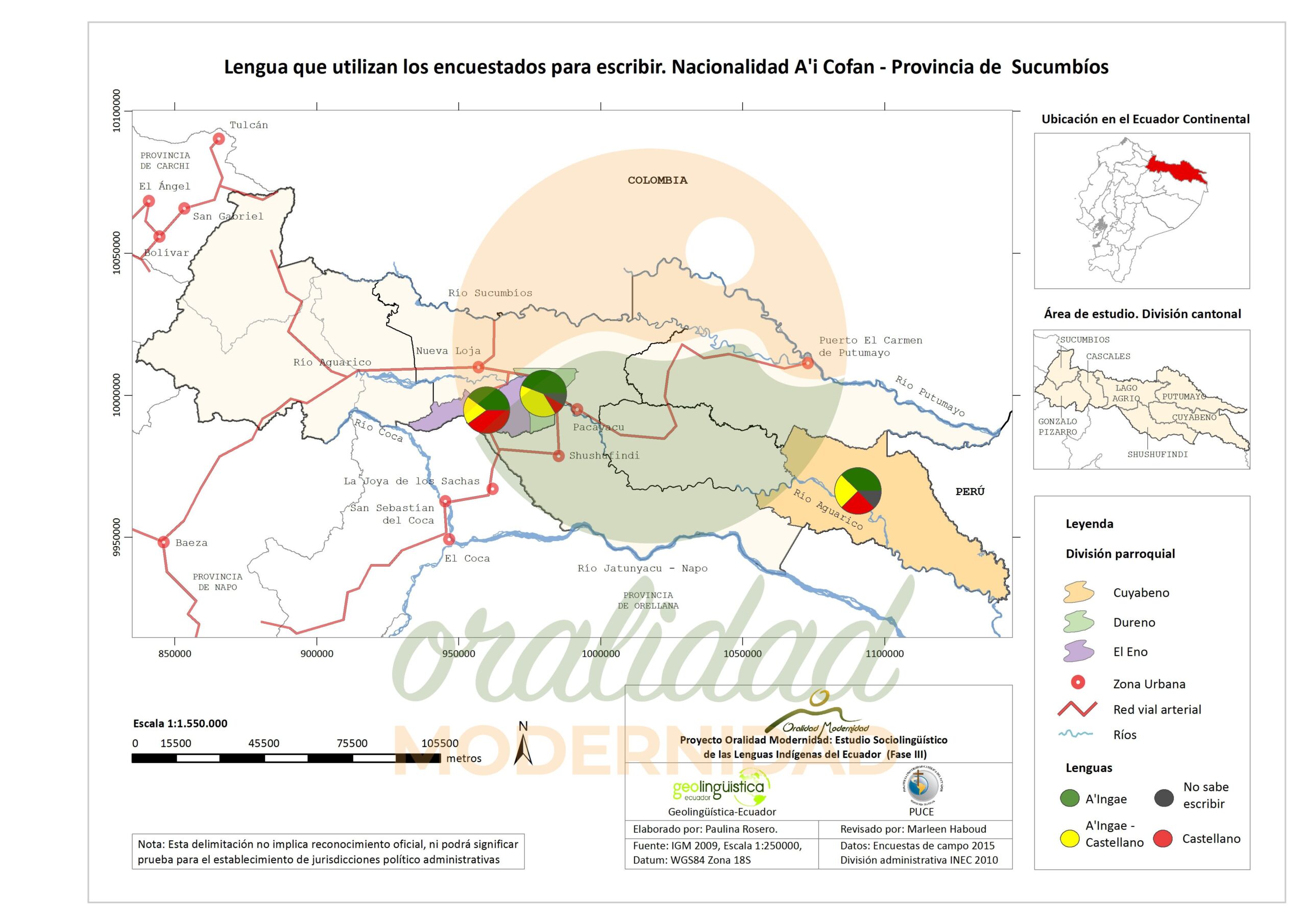 Cite: Haboud, M. (2014). Mapa de la lengua que utilizan los encuestados para escribir de la nacionalidad A’iCofan en la provincia de Sucumbíos – Lengua A’Ingae. Programa Oralidad Modernidad/GeolingüísticaEcuador.https://oralidadmodernidad.org/cartografia-aingae/