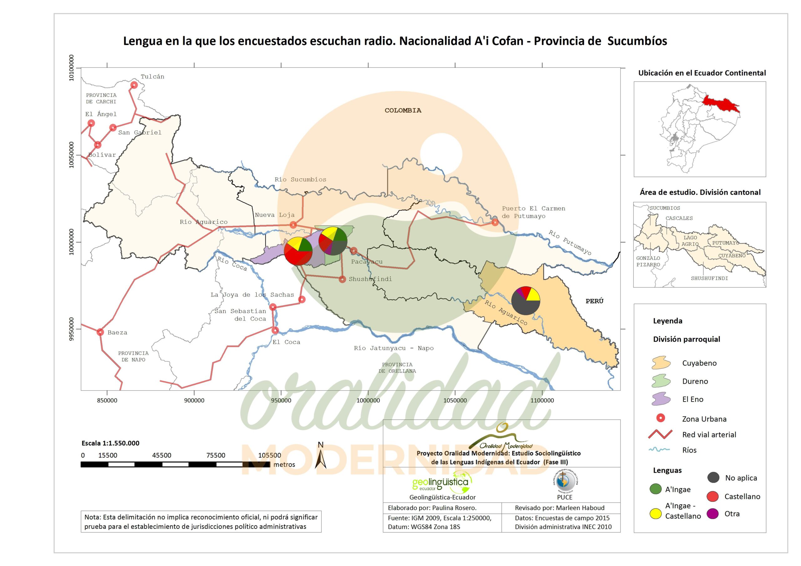 Cite: Haboud, M. (2014). Mapa de la lengua en la que los encuestados escuchan la radio de la nacionalidad A’i Cofan en la provincia de Sucumbíos – Lengua A’Ingae. Programa Oralidad Modernidad/GeolingüísticaEcuador.https://oralidadmodernidad.org/cartografia-aingae/