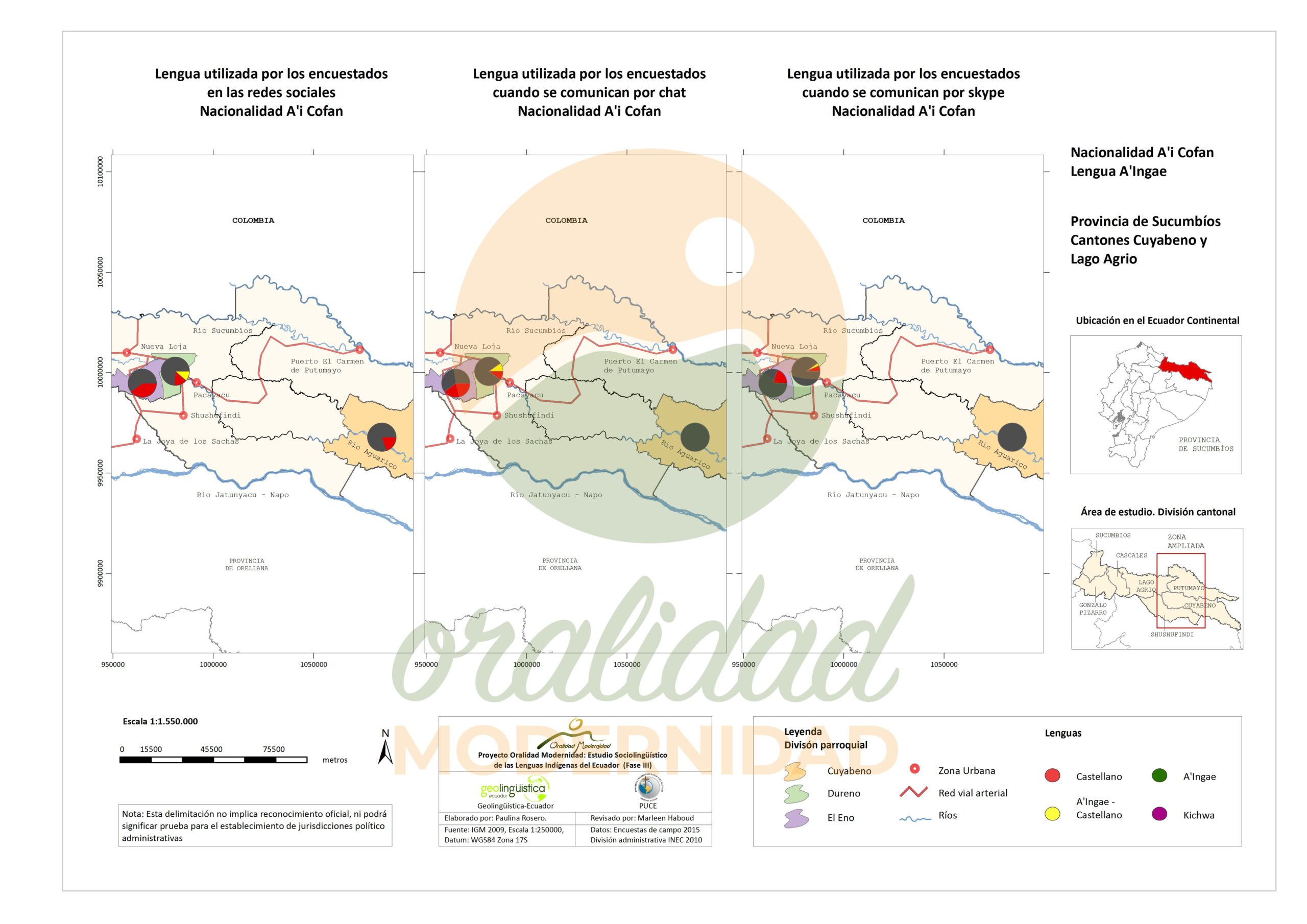Cite: Haboud, M. (2014). Mapa de la lengua utilizada por los encuestados en las redes sociales, cuando se comunican por chat y por Skype de la nacionalidad A’i Cofan en la provincia de Sucumbíos – Lengua A’Ingae. Programa Oralidad Modernidad/GeolingüísticaEcuador.https://oralidadmodernidad.org/cartografia-aingae/