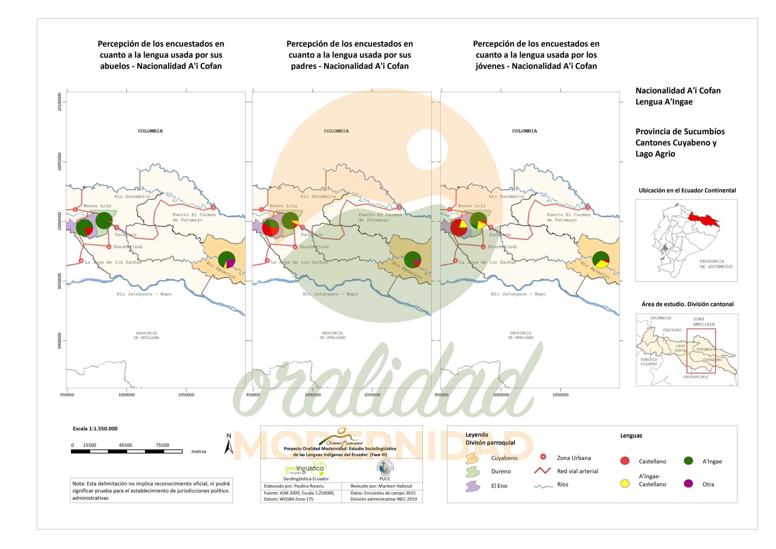 Cite: Haboud, M. (2014). Mapa de la percepción de los encuestados en cuanto a la lengua usada por sus abuelos, por sus padres y por sus jóvenes de la nacionalidad A’iCofan en la provincia de Sucumbíos – Lengua A’Ingae. Programa Oralidad Modernidad/GeolingüísticaEcuador.https://oralidadmodernidad.org/cartografia-aingae/