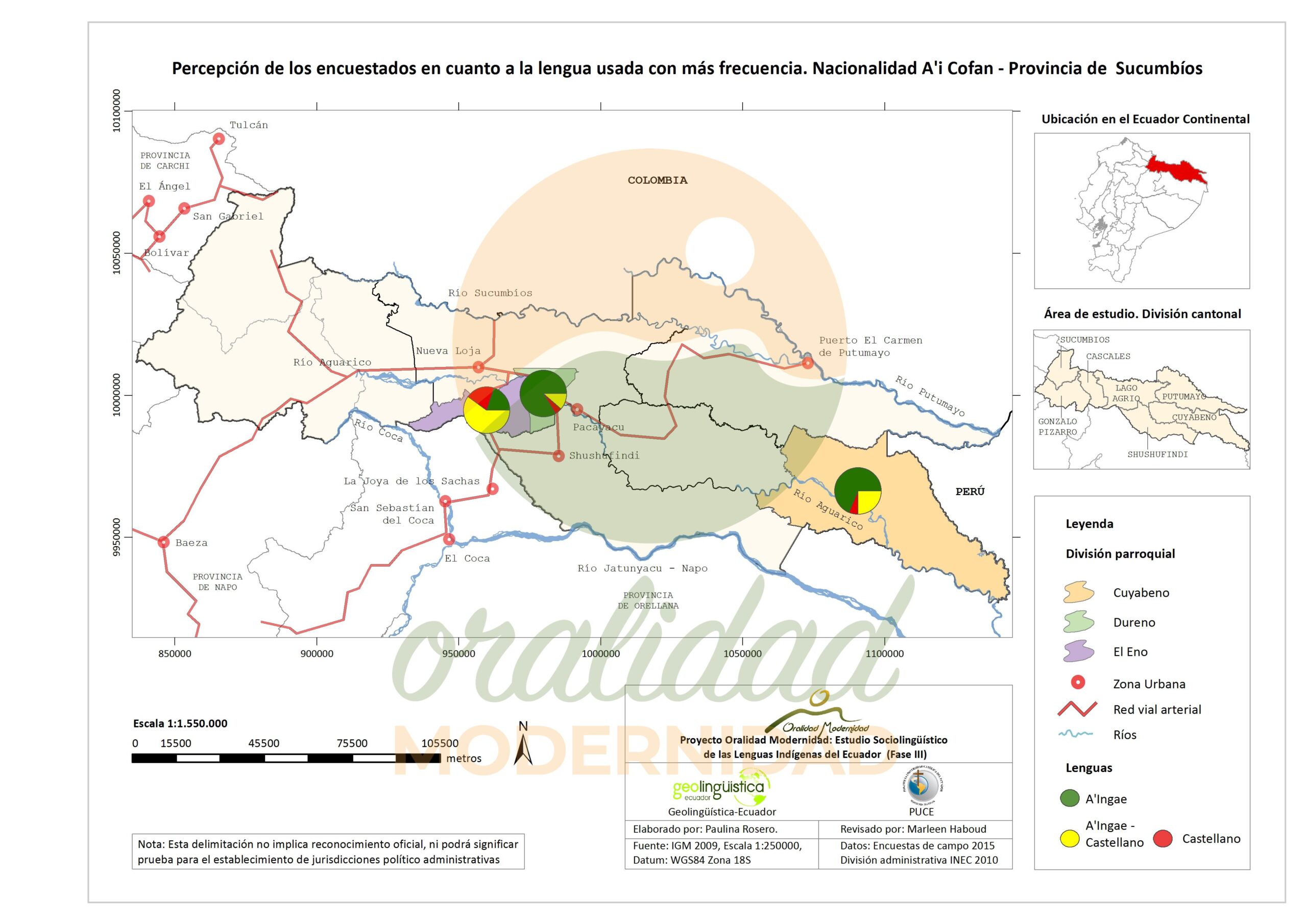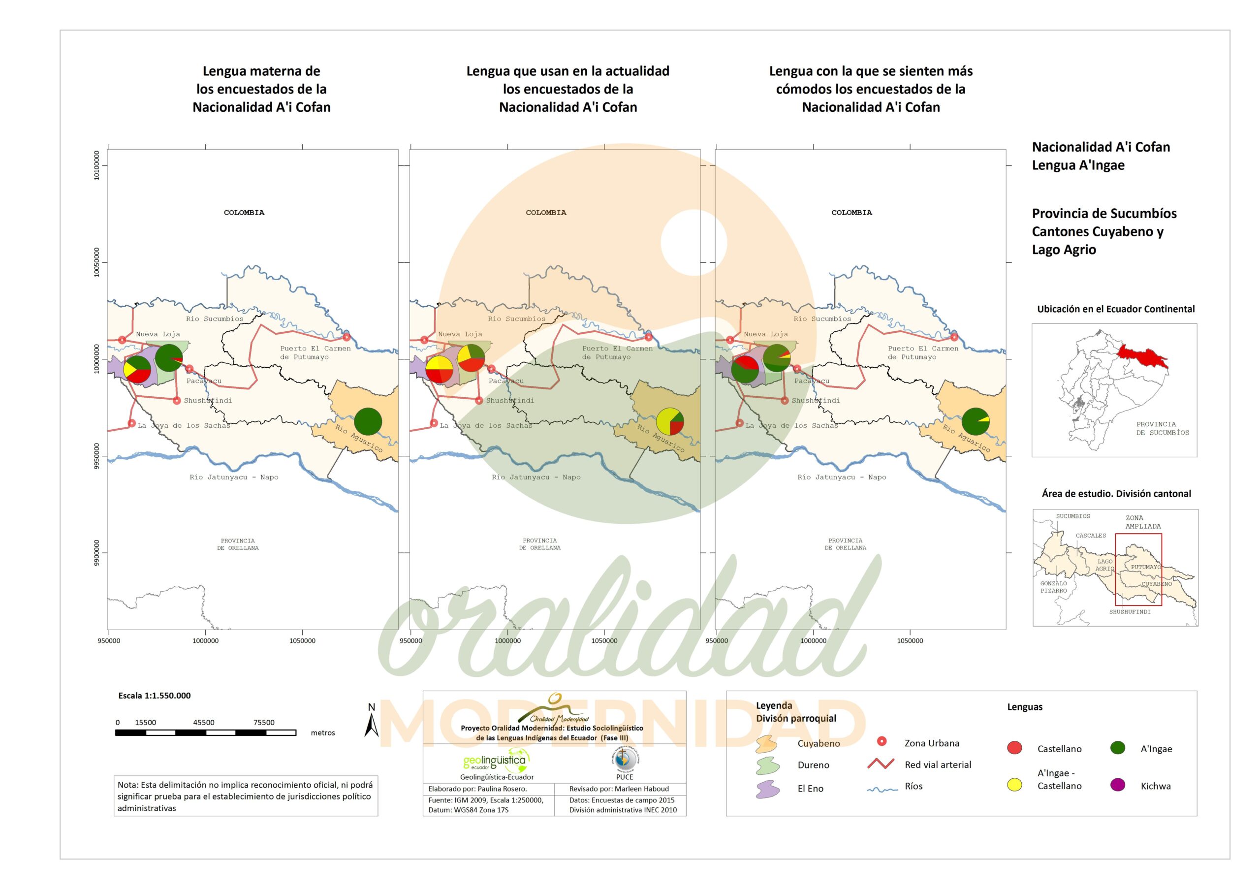 Cite: Haboud, M. (2014). Mapa de la lengua materna, lengua que usan en la actualidad, y lengua con la que se sienten más cómodos los encuestados de la nacionalidad A’iCofan en la provincia de Sucumbíos – Lengua A’Ingae. Programa Oralidad Modernidad/GeolingüísticaEcuador.https://oralidadmodernidad.org/cartografia-aingae/