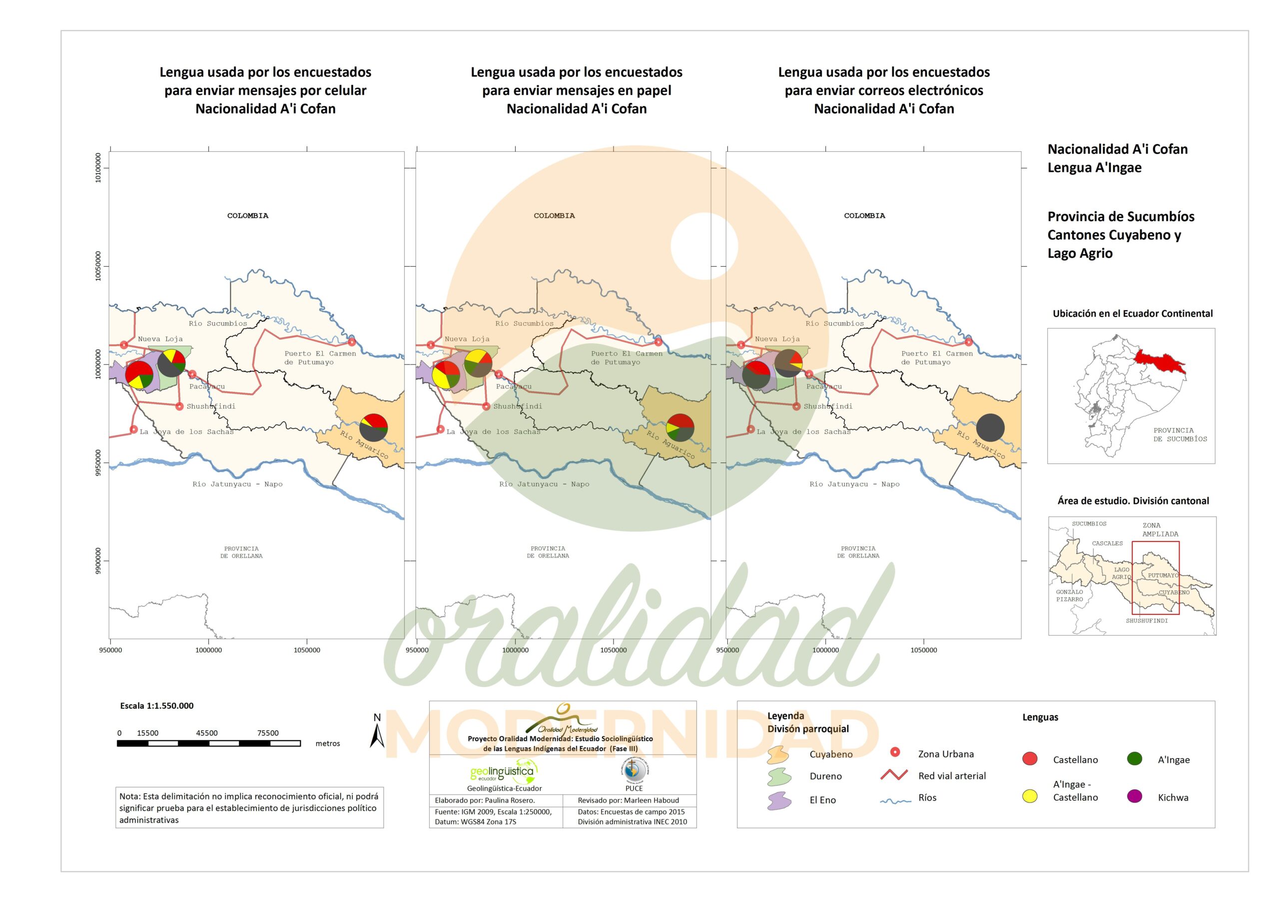 Cite: Haboud, M. (2014). Mapa de la lengua usada por los encuestados para enviar mensajes por celular, mensajes en papel y correos electrónicos de la nacionalidad A’i Cofan en la provincia de Sucumbíos – Lengua A’Ingae. Programa Oralidad Modernidad/GeolingüísticaEcuador.https://oralidadmodernidad.org/cartografia-aingae/
