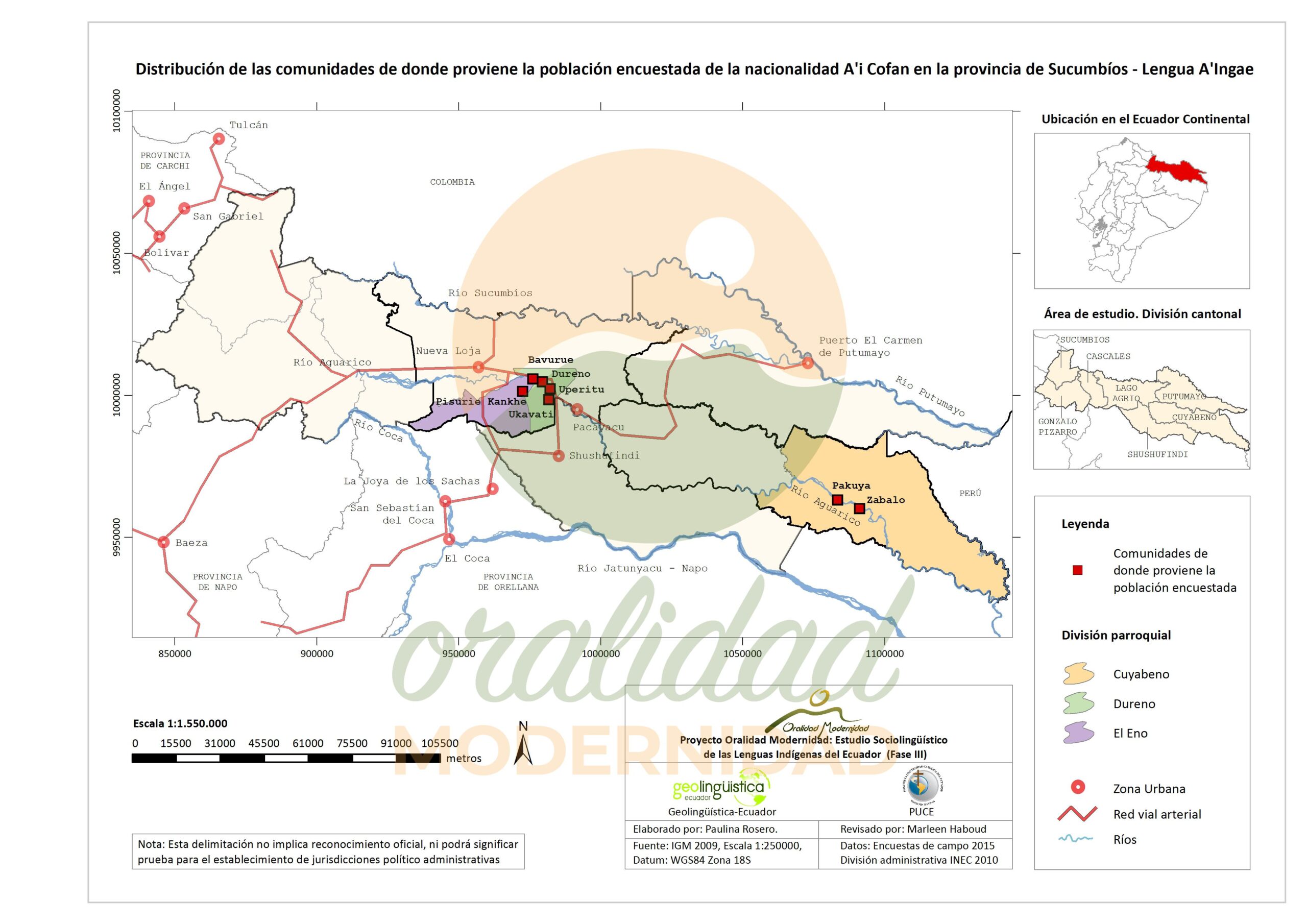 Cite: Haboud, M. (2014). Mapa de la distribución de las comunidades de donde proviene la población encuestada de la nacionalidad A’iCofan en la provincia de Sucumbíos – Lengua A’Ingae. Programa Oralidad Modernidad/GeolingüísticaEcuador.https://oralidadmodernidad.org/cartografia-aingae/