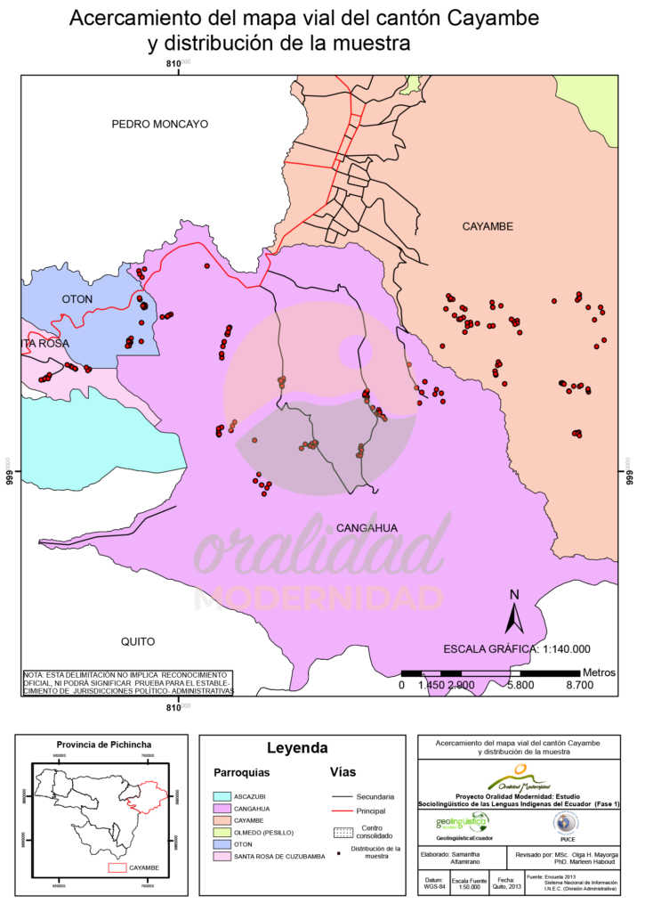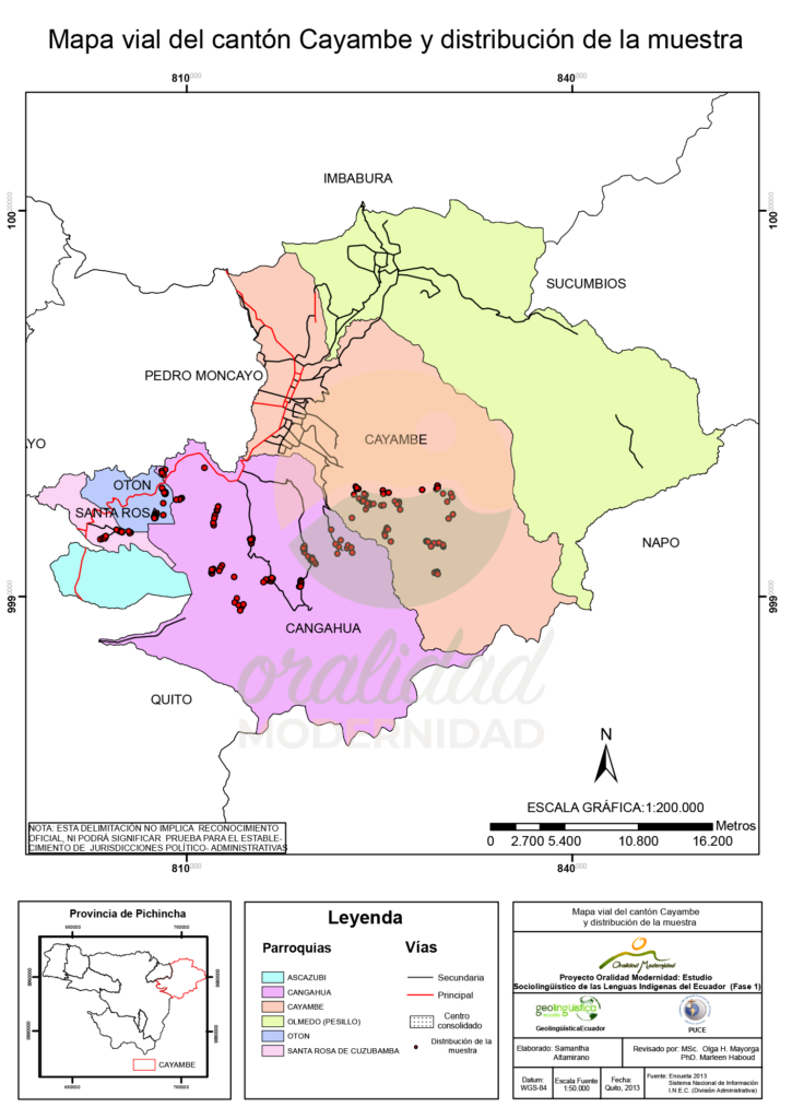 Cite: Haboud, M. (2013). Acercamiento del mapa vial del cantón Cayambe y distribución de la muestra. Programa Oralidad Modernidad/ GeolingüísticaEcuador. https://oralidadmodernidad.org/cartografia-cayambe/
