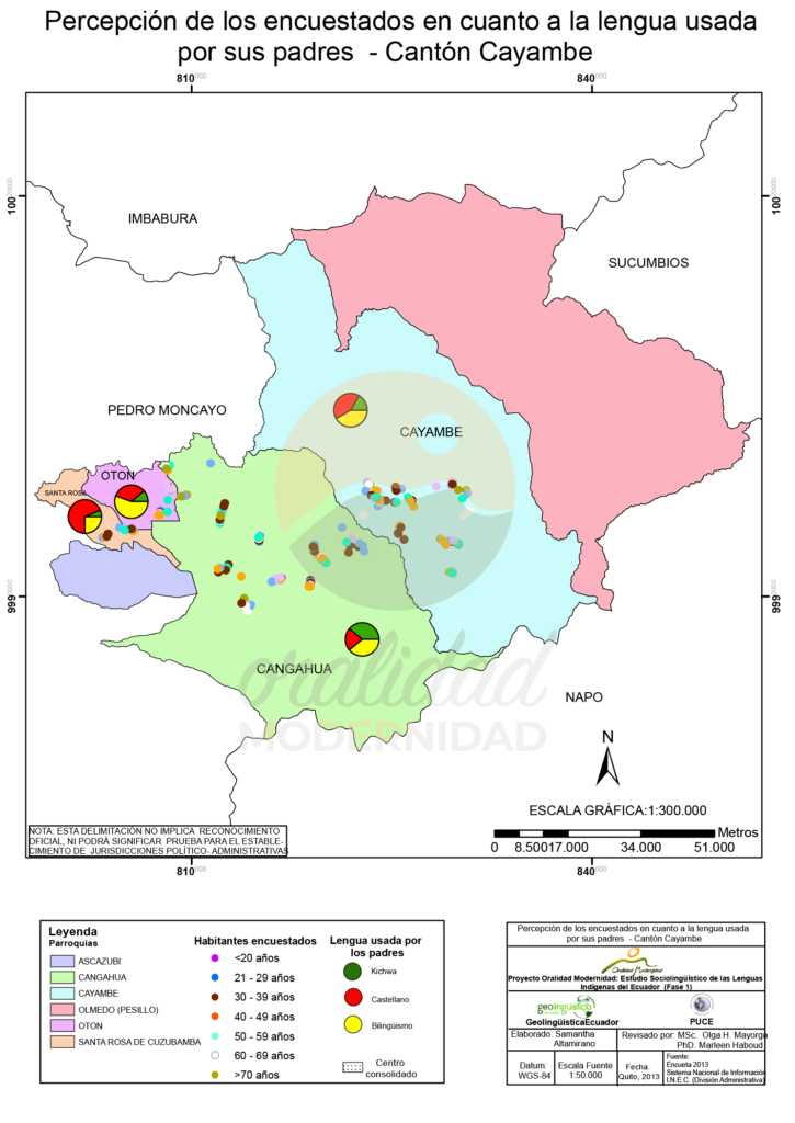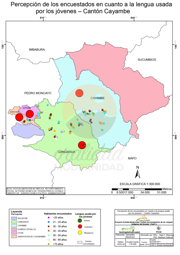 Cite: Haboud, M. (2013). Mapa de percepción de los encuestados en cuanto a la lengua usada por los jóvenes en el cantón Cayambe. Programa Oralidad Modernidad/GeolingüísticaEcuador. https://oralidadmodernidad.org/cartografia-cayambe/