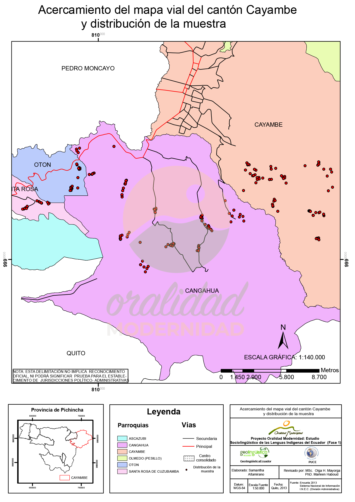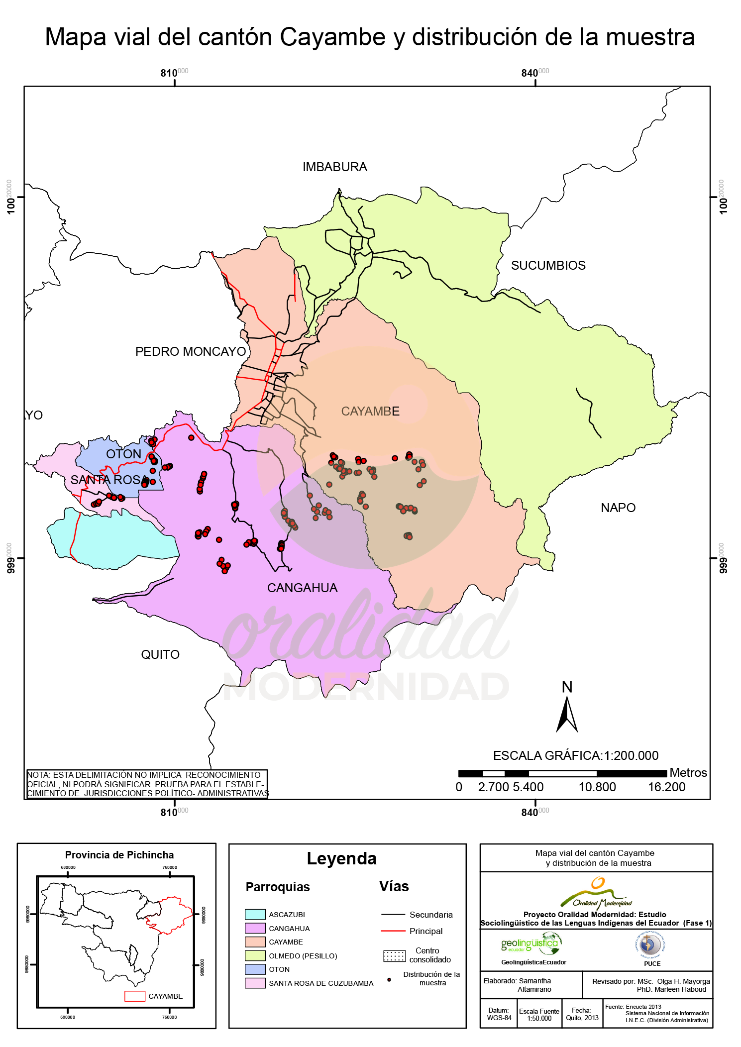 Cite: Haboud, M. (2013). Acercamiento del mapa vial del cantón Cayambe y distribución de la muestra. Programa Oralidad Modernidad/ GeolingüísticaEcuador. https://oralidadmodernidad.org/cartografia-cayambe/