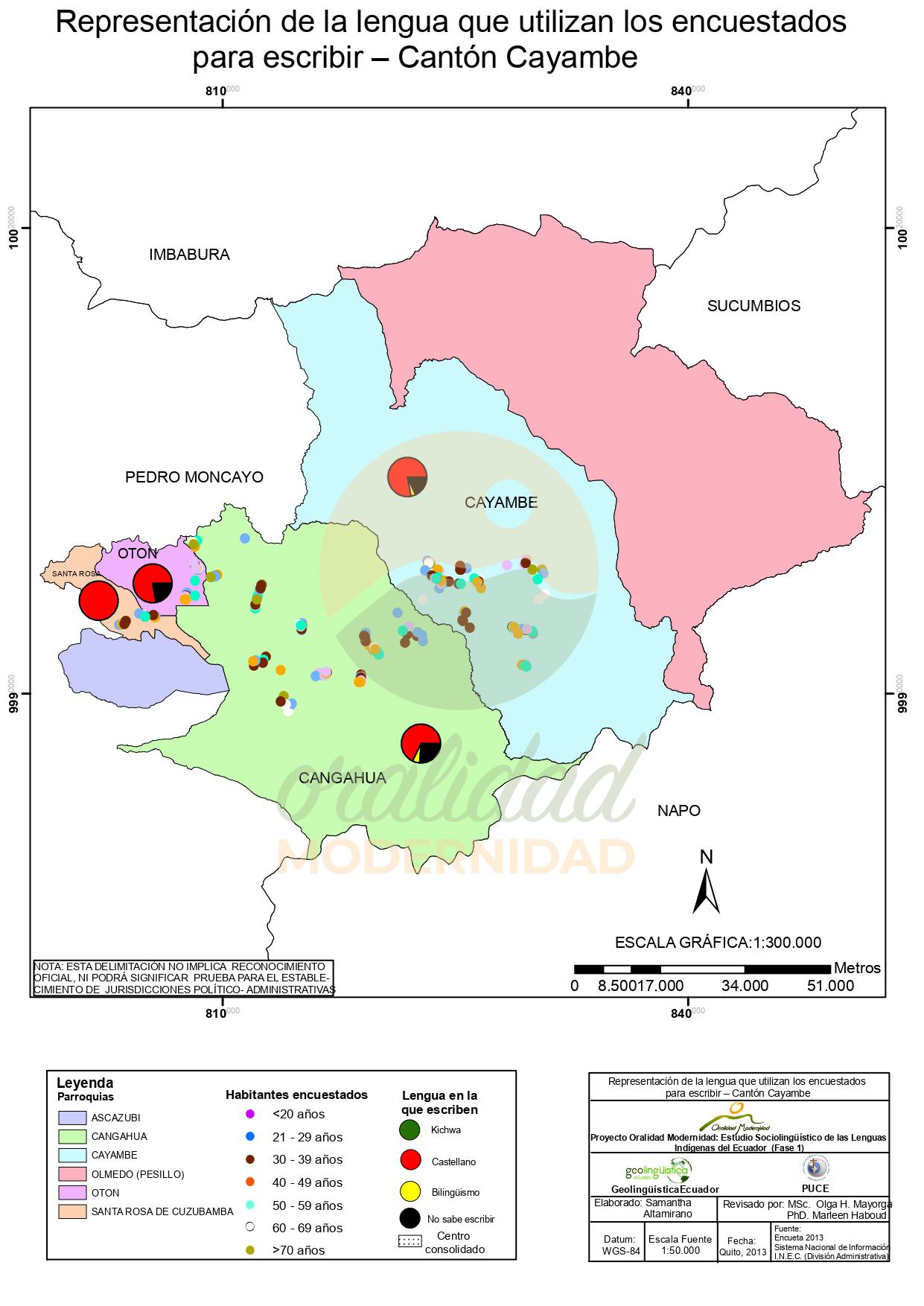 Cite: Haboud, M. (2013). Mapa de representación de la lengua que utilizan los encuestados para escribir – Cantón Cayambe. Programa Oralidad Modernidad/GeolingüísticaEcuador. https://oralidadmodernidad.org/cartografia-cayambe/