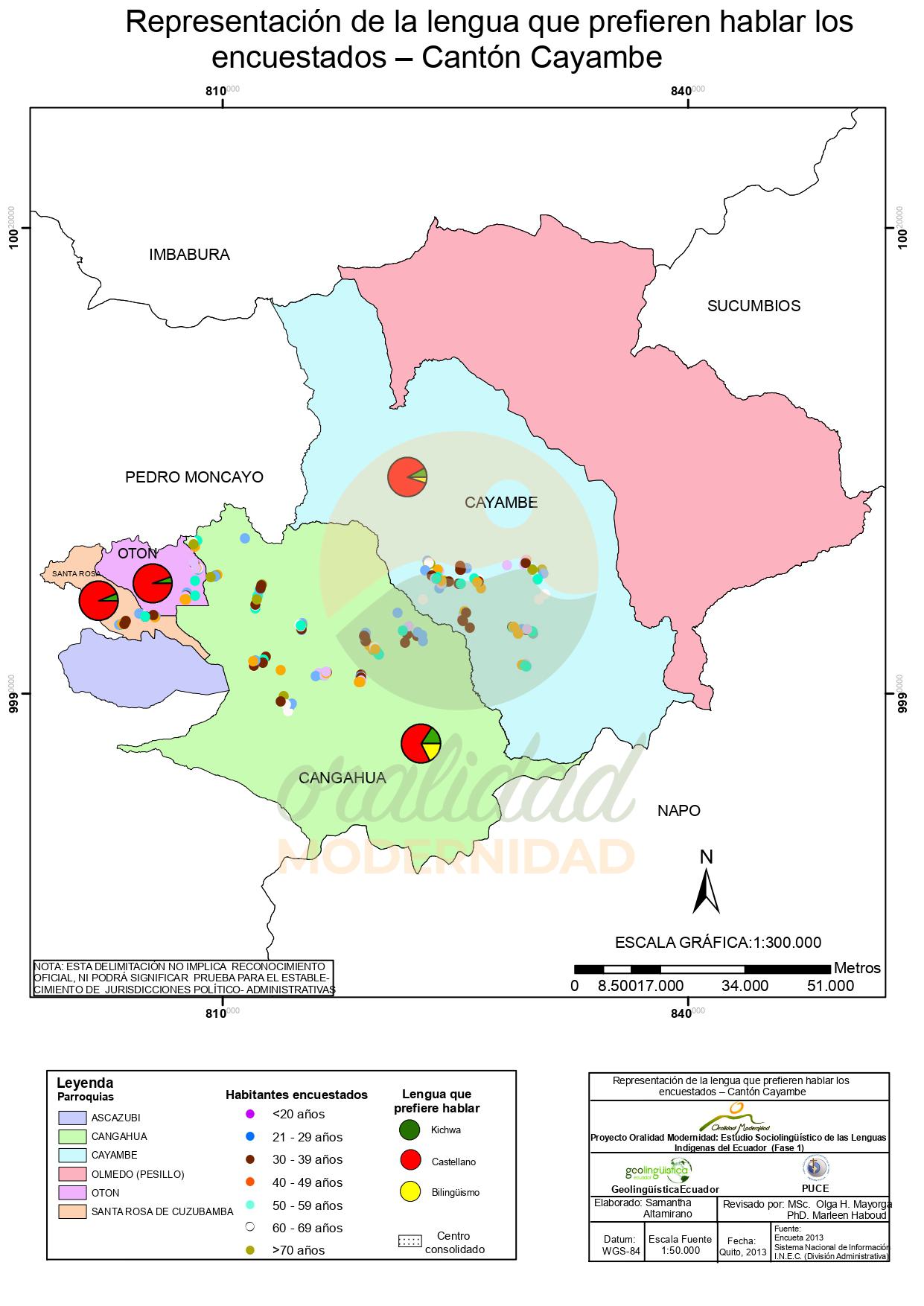 Cite: Haboud, M. (2013). Mapa de percepción de los encuestados en cuanto a la lengua usada por los jóvenes en el cantón Cayambe. Programa Oralidad Modernidad/GeolingüísticaEcuador. https://oralidadmodernidad.org/cartografia-cayambe/