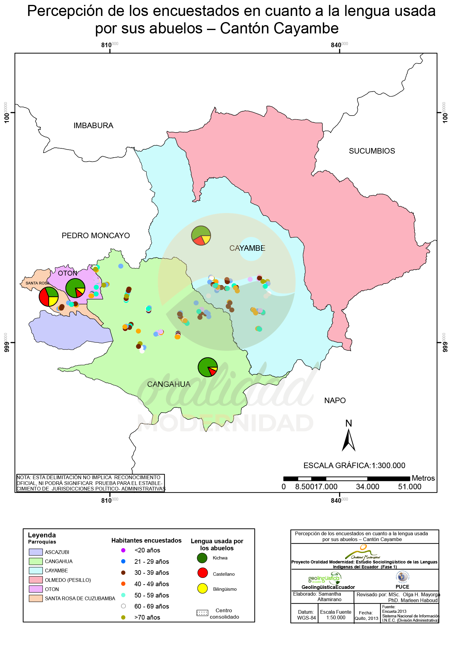 Cite: Haboud, M. (2013). Mapa de percepción de los encuestados en cuanto a la lengua usada por sus abuelos en el cantón Cayambe. Programa Oralidad Modernidad/GeolingüísticaEcuador. https://oralidadmodernidad.org/cartografia-cayambe/