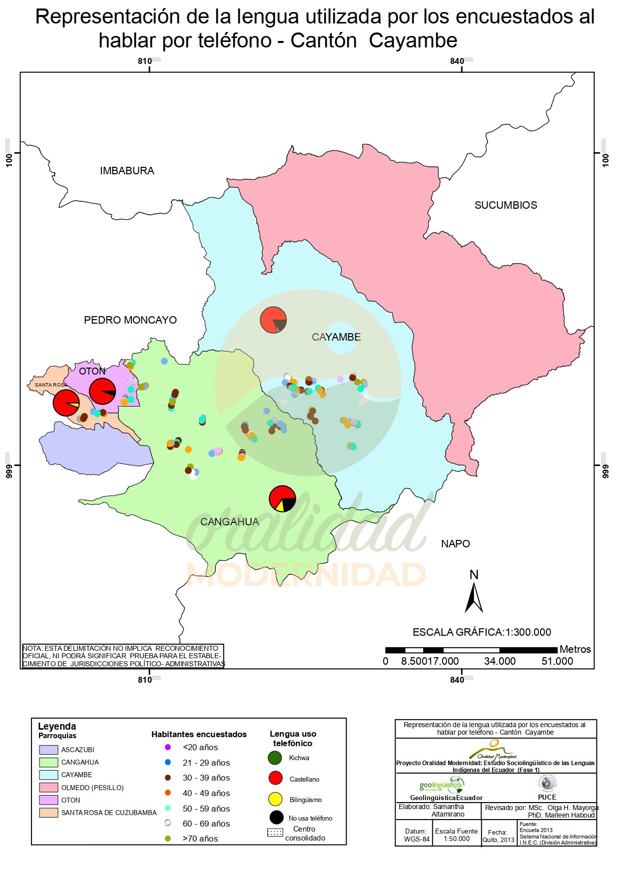 Cite: Haboud, M. (2013). Mapa de representación de la lengua utilizada por los encuestados al hablar por teléfono – Cantón Cayambe. Programa Oralidad Modernidad/GeolingüísticaEcuador. https://oralidadmodernidad.org/cartografia-cayambe/