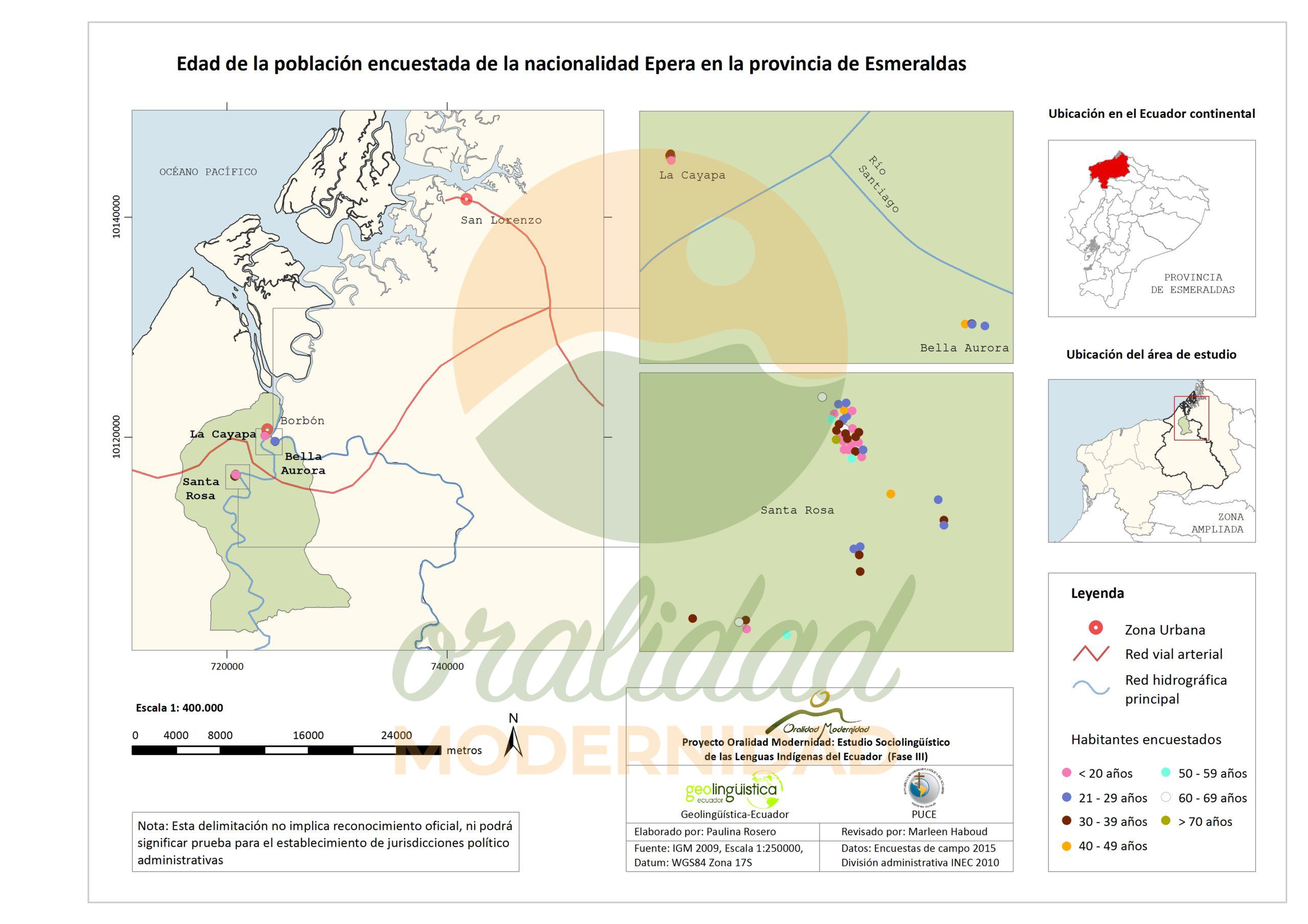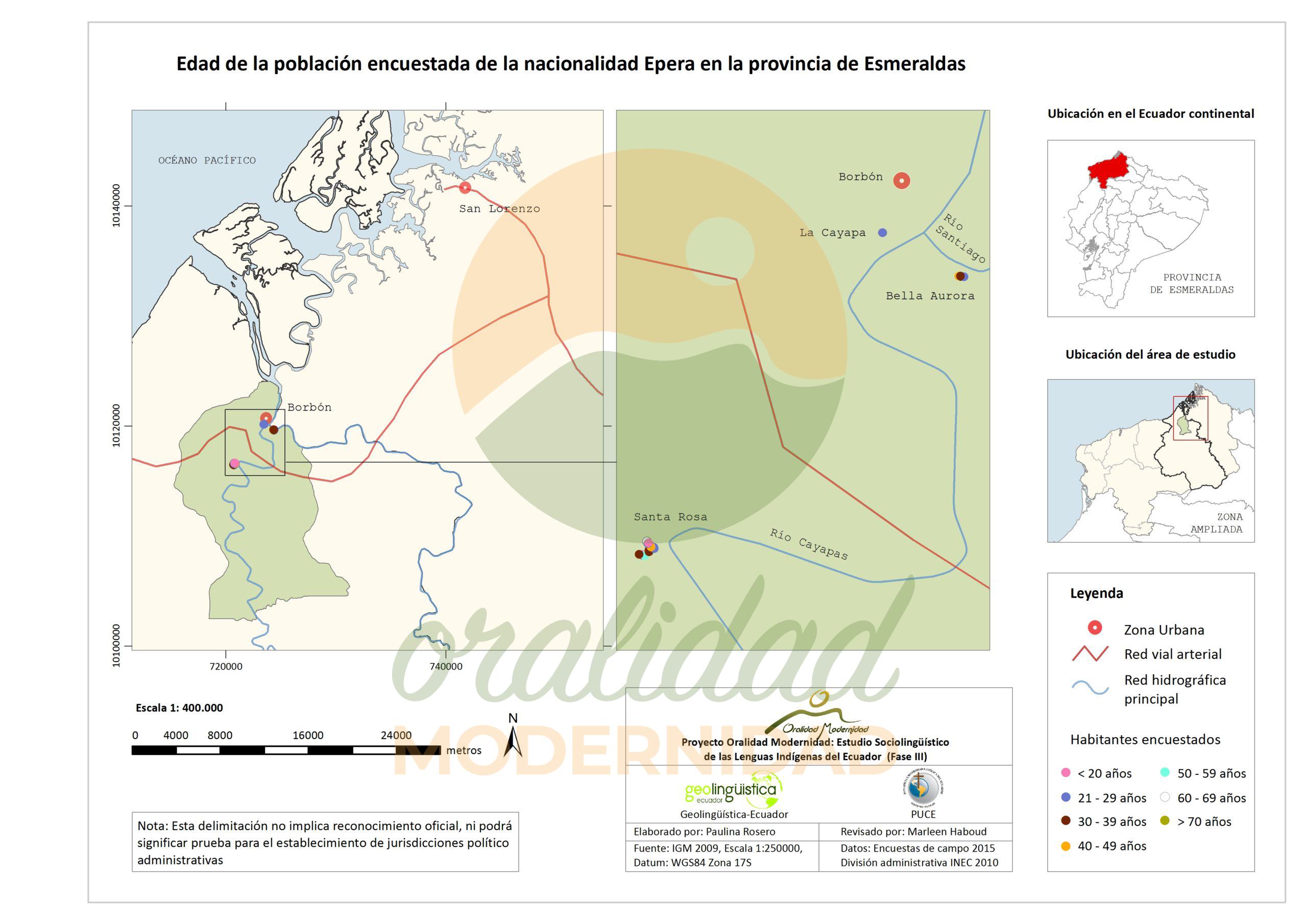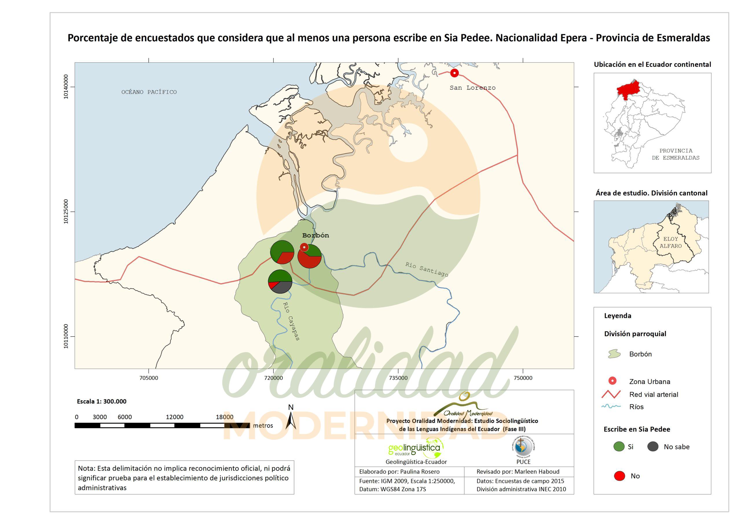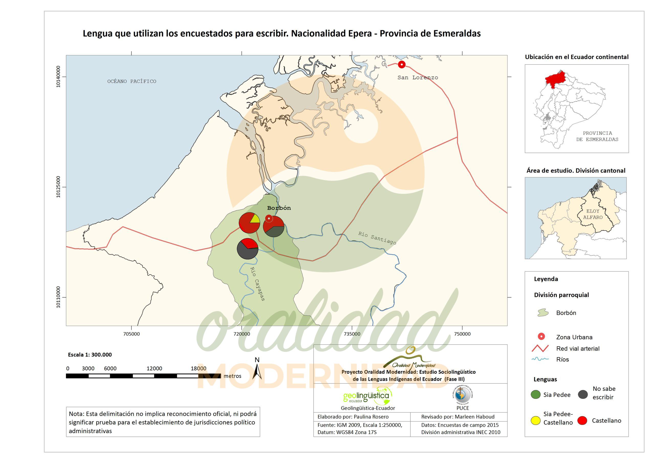 Cite: Haboud, M. (2015). Mapa de la lengua que utilizan los encuestados de la nacionalidad Epera para escribir – Provincia de Esmeraldas. Programa Oralidad Modernidad/GeolingüísticaEcuador. https://oralidadmodernidad.org/cartografia-epera/