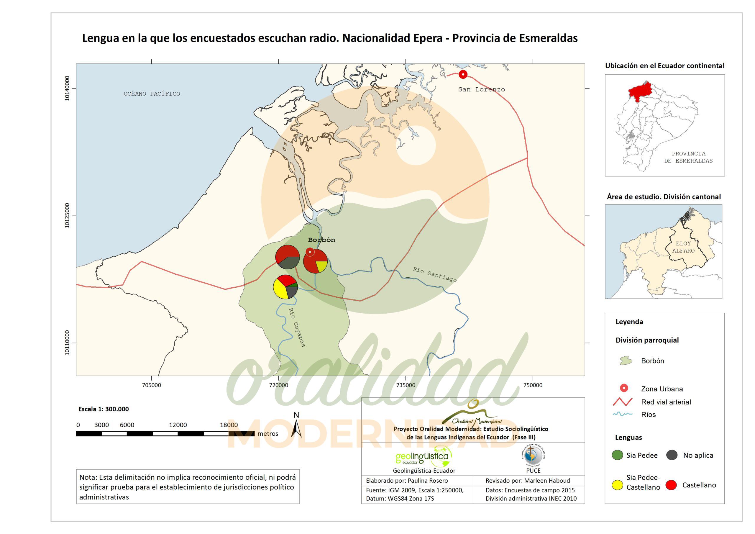 Cite: Haboud, M. (2015). Mapa de la lengua en la que los encuestados de la nacionalidad Epera escuchan radio – Provincia de Esmeraldas. Programa Oralidad Modernidad/GeolingüísticaEcuador. https://oralidadmodernidad.org/cartografia-epera/