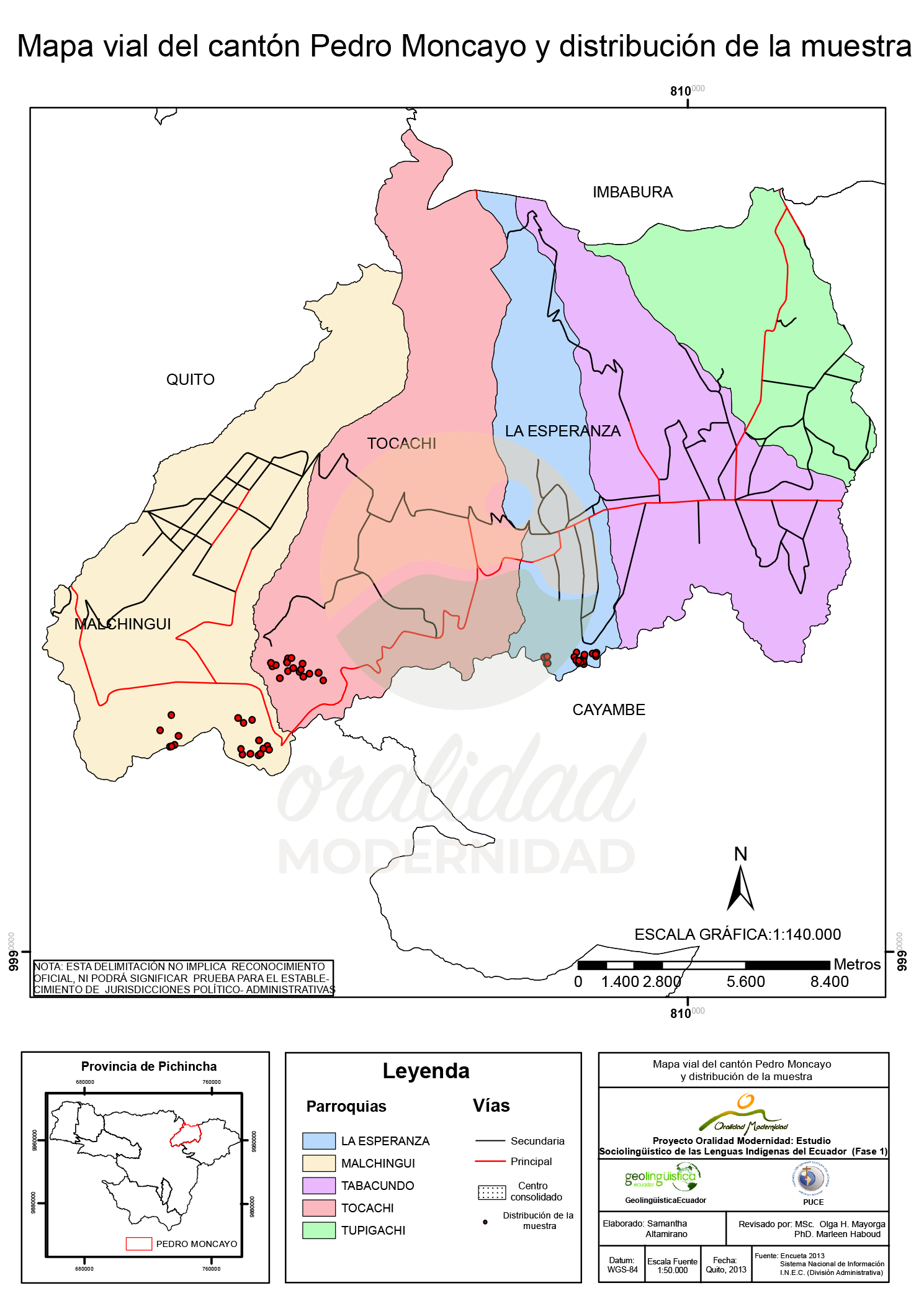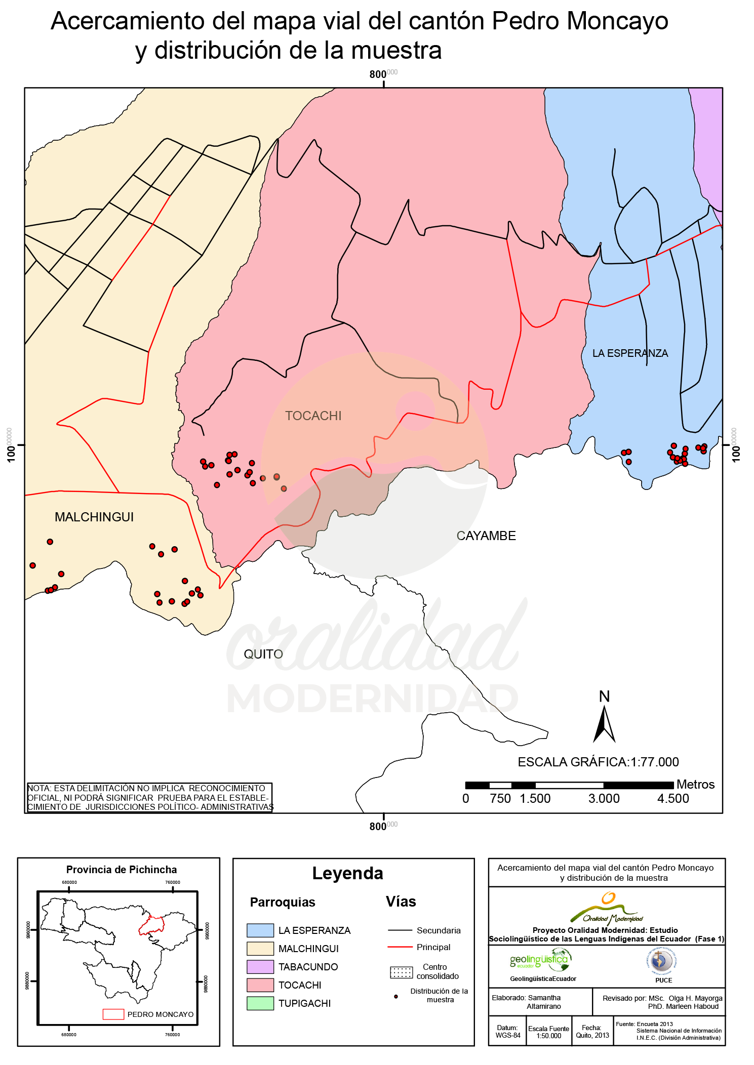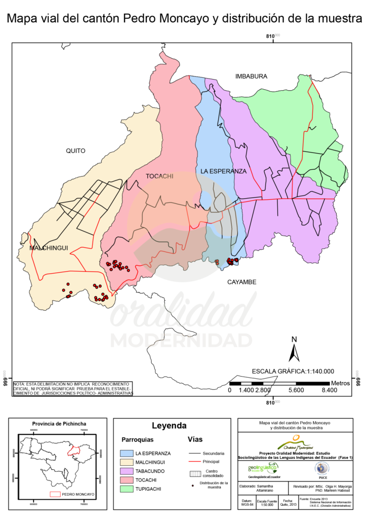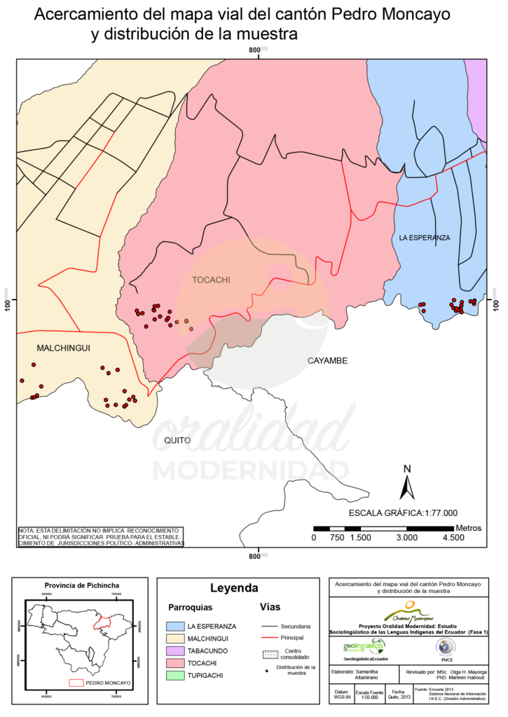Cite: Haboud, M. (2013). Mapa vial del cantón Pedro Moncayo y distribución de la muestra. Programa Oralidad Modernidad/GeolingüísticaEcuador. https://oralidadmodernidad.org/cartografia-pedro-moncayo/