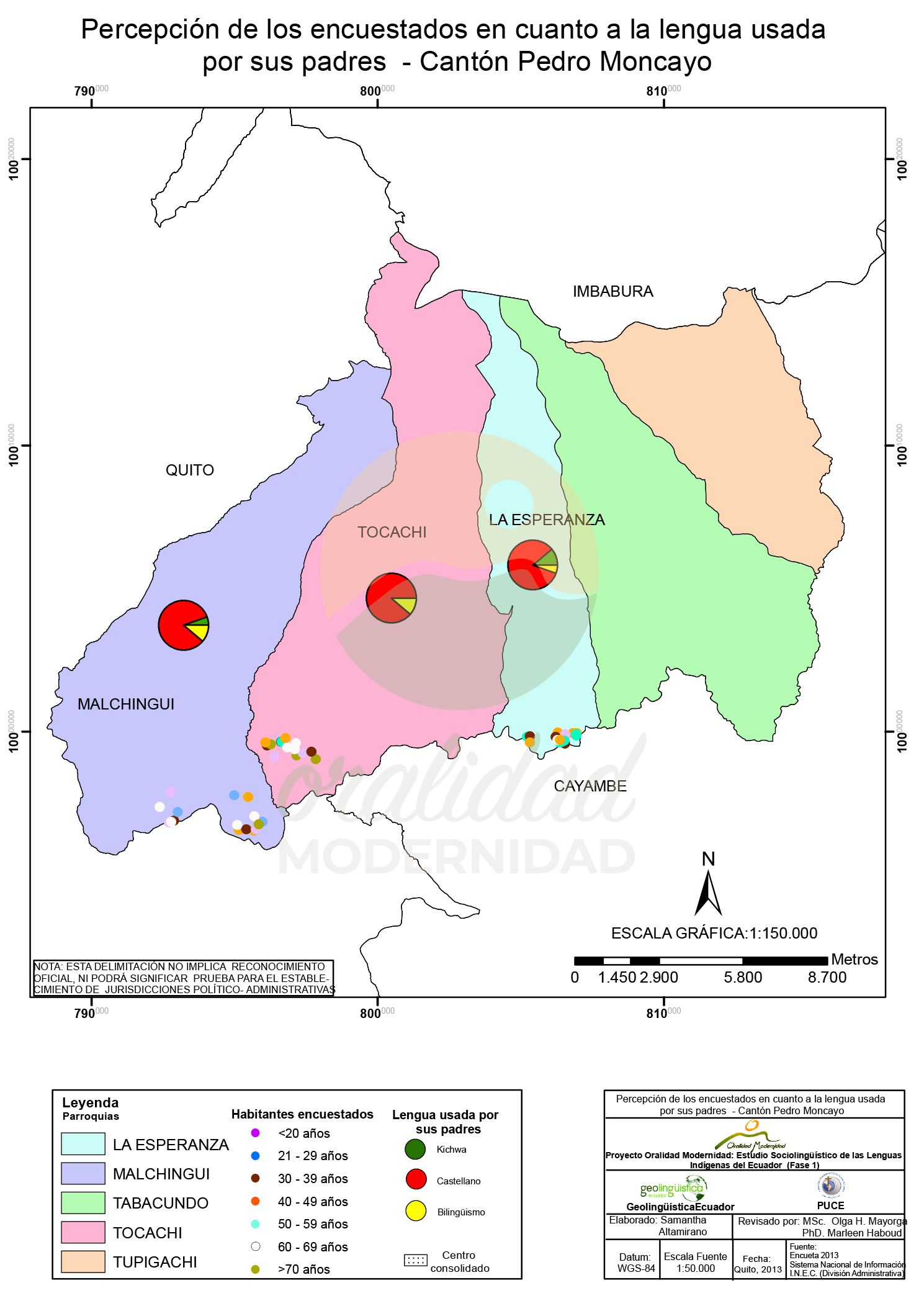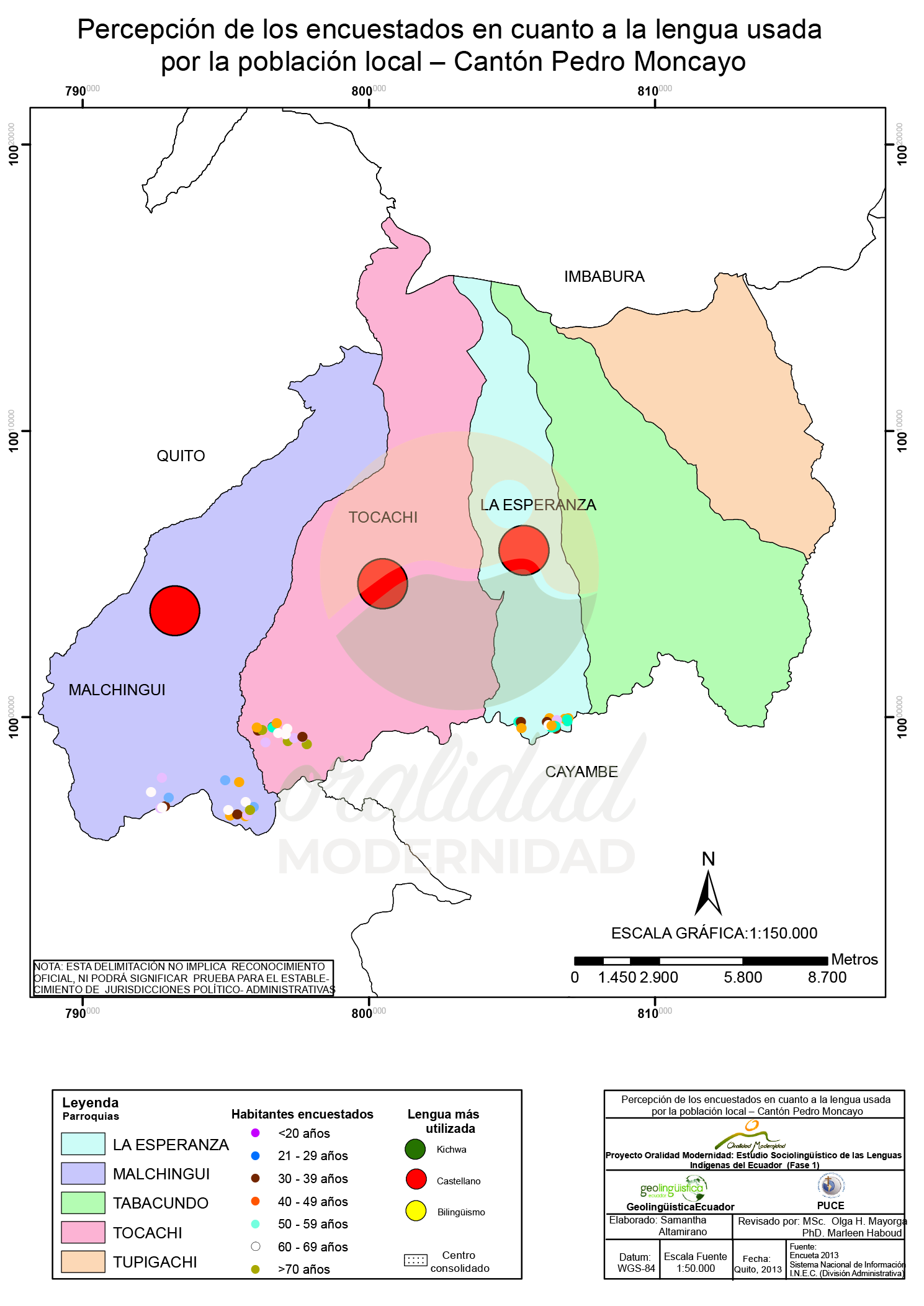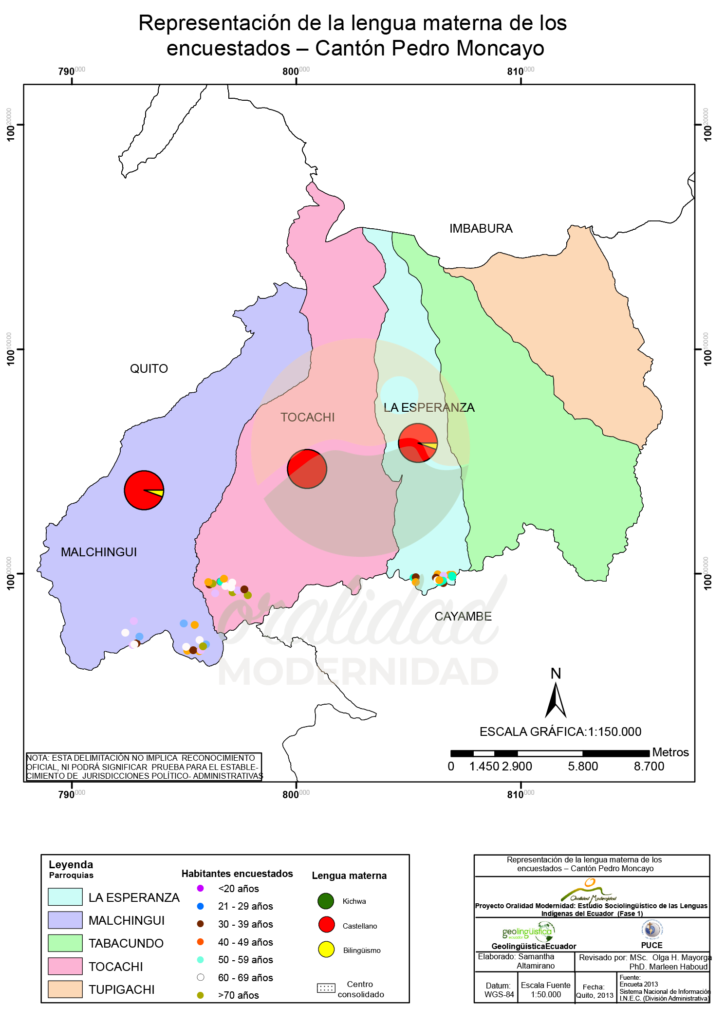 Cite: Haboud, M. (2013). Mapa de representación de la lengua materna de los encuestados en el cantón Pedro Moncayo. Programa Oralidad Modernidad/GeolingüísticaEcuador. https://oralidadmodernidad.org/cartografia-pedro-moncayo/