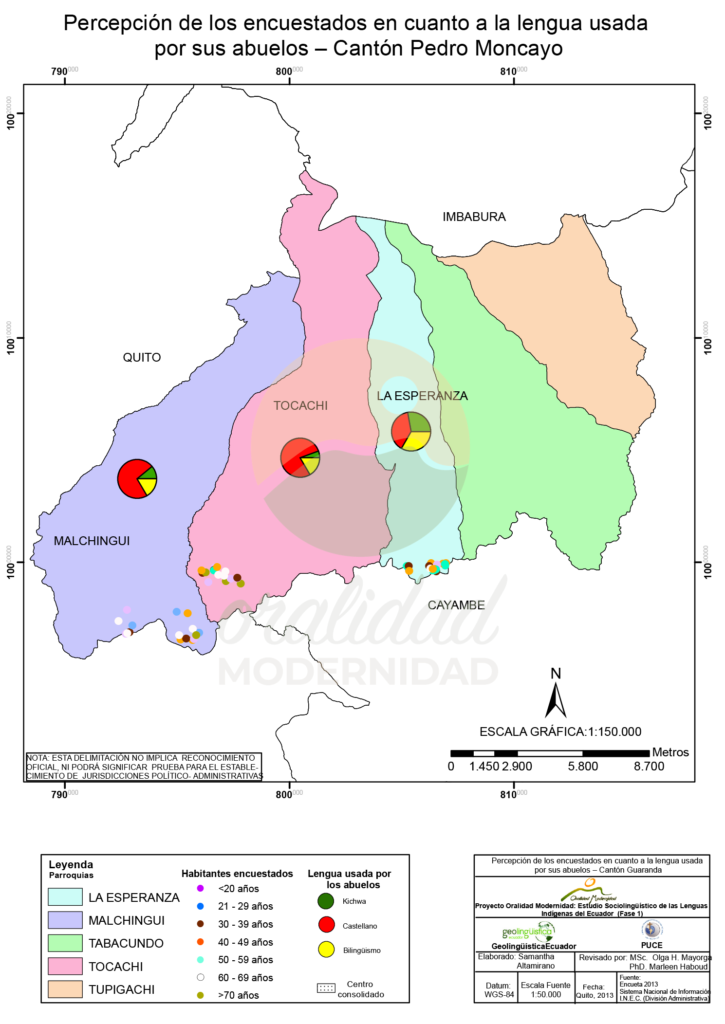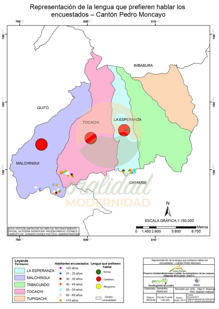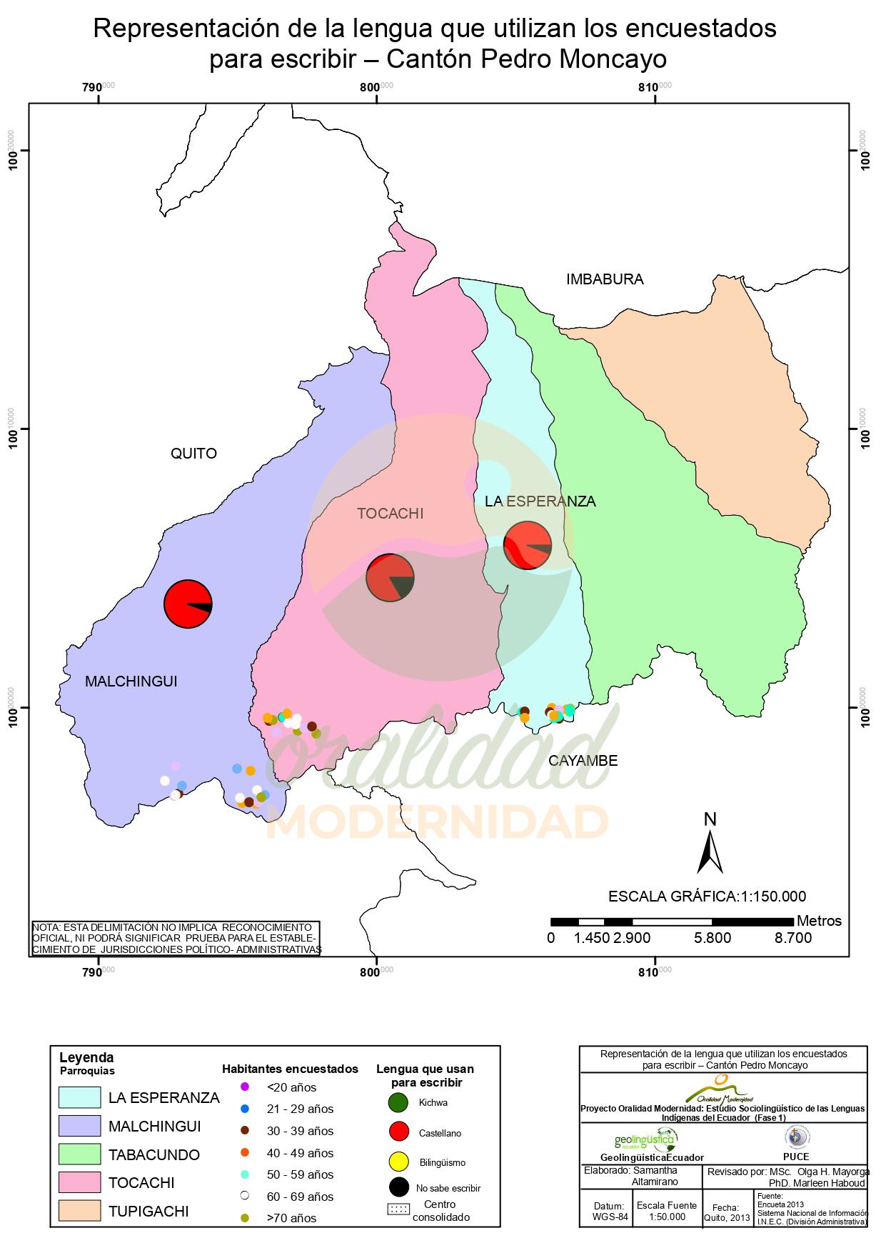 Cite: Haboud, M. (2013). Mapa de representación de la lengua que utilizan los encuestados para escribir – Cantón Pedro Moncayo. Programa Oralidad Modernidad/GeolingüísticaEcuador. https://oralidadmodernidad.org/cartografia-pedro-moncayo/