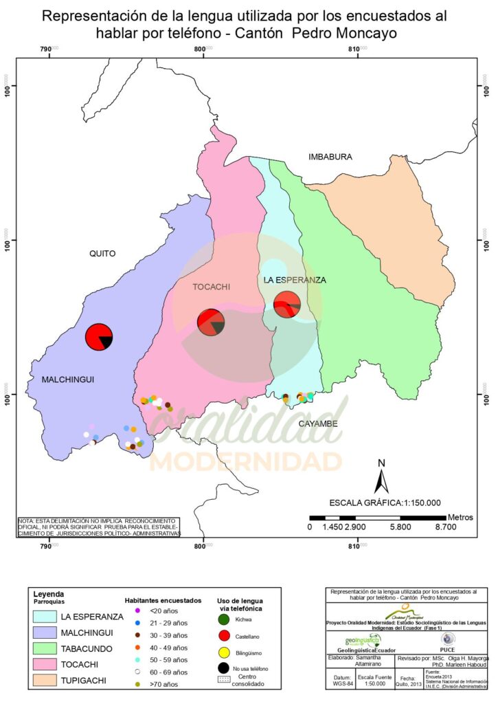 Cite: Haboud, M. (2013). Mapa de representación de la lengua utilizada por los encuestados al hablar por teléfono – Cantón Pedro Moncayo. Programa Oralidad Modernidad/GeolingüísticaEcuador. https://oralidadmodernidad.org/cartografia-pedro-moncayo/