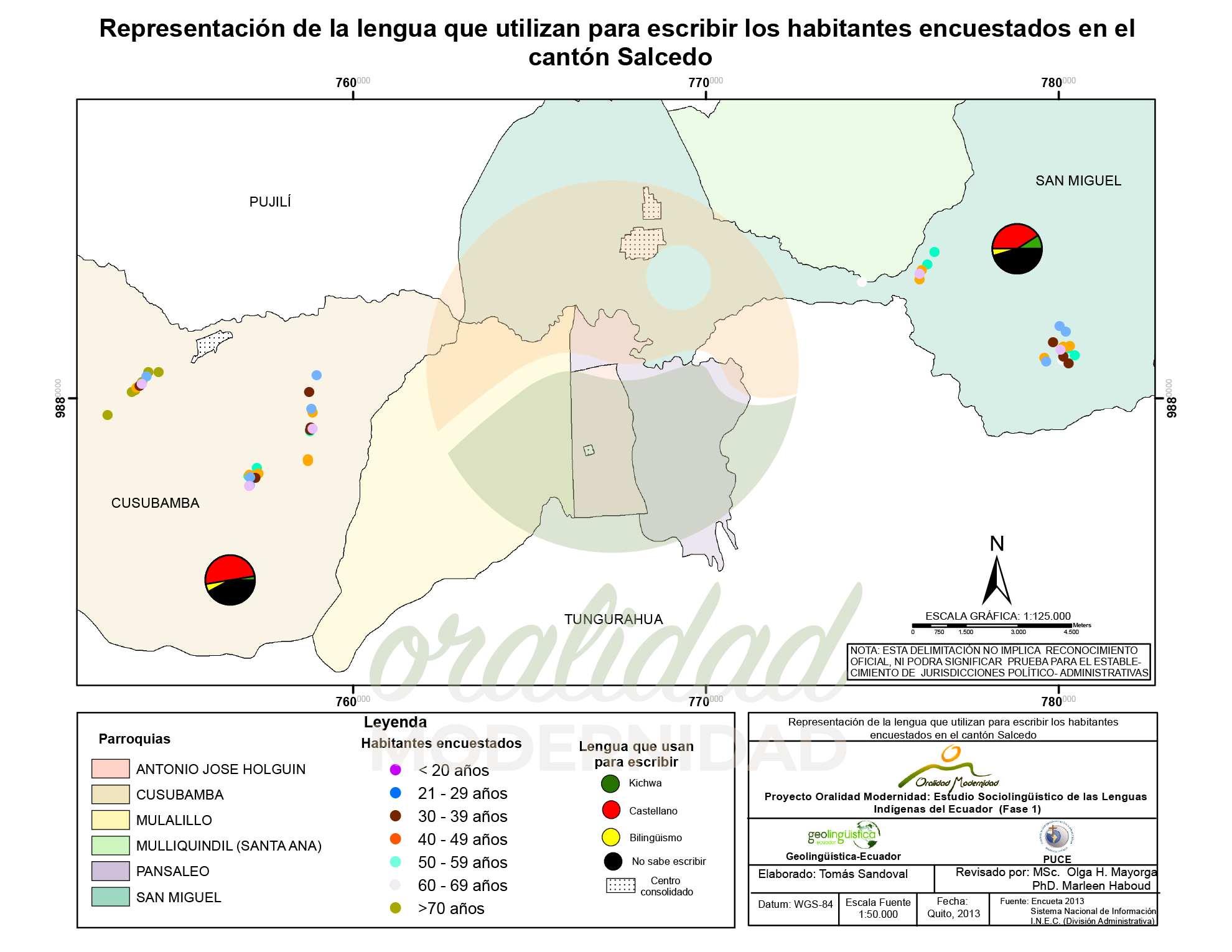 Cite: Haboud, M. (2013). Mapa de representación de la lengua que utilizan para escribir los habitantes encuestados en el cantón Salcedo. Programa Oralidad Modernidad/GeolingüísticaEcuador. https://oralidadmodernidad.org/cartografia-salcedo/
