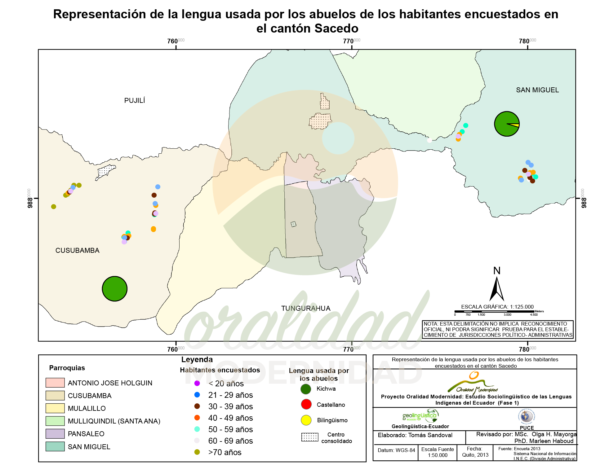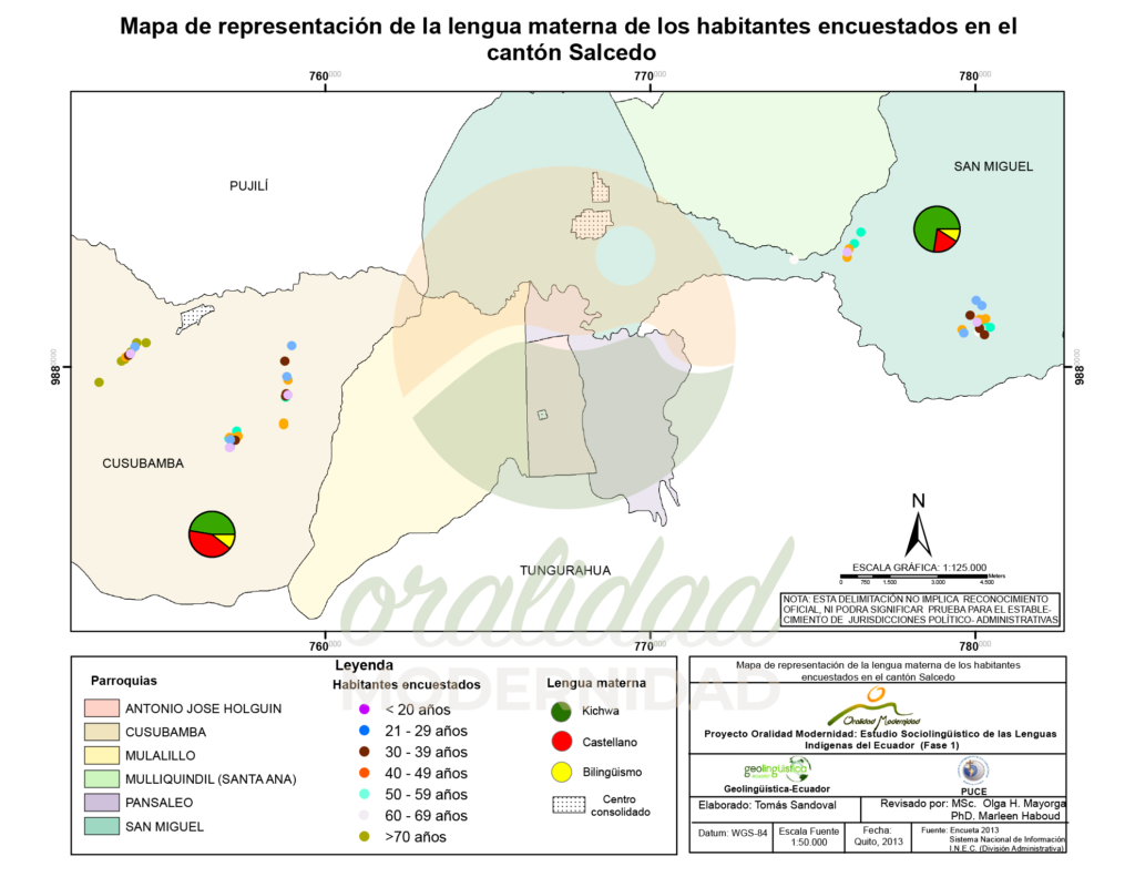 Cite: Haboud, M. (2013). Mapa de representación de la lengua materna de los habitantes encuestados en el cantón Salcedo. Programa Oralidad Modernidad/GeolingüísticaEcuador. https://oralidadmodernidad.org/cartografia-salcedo/