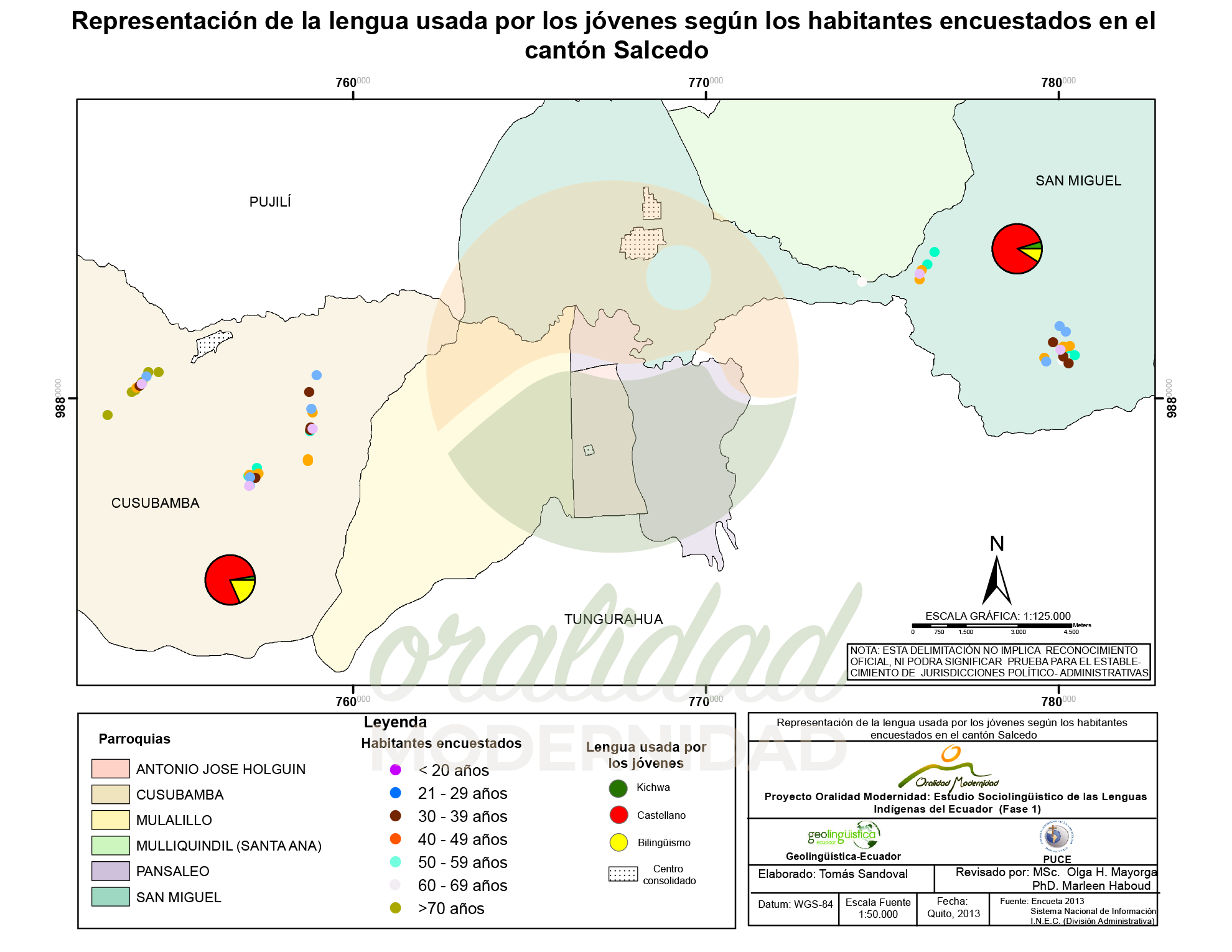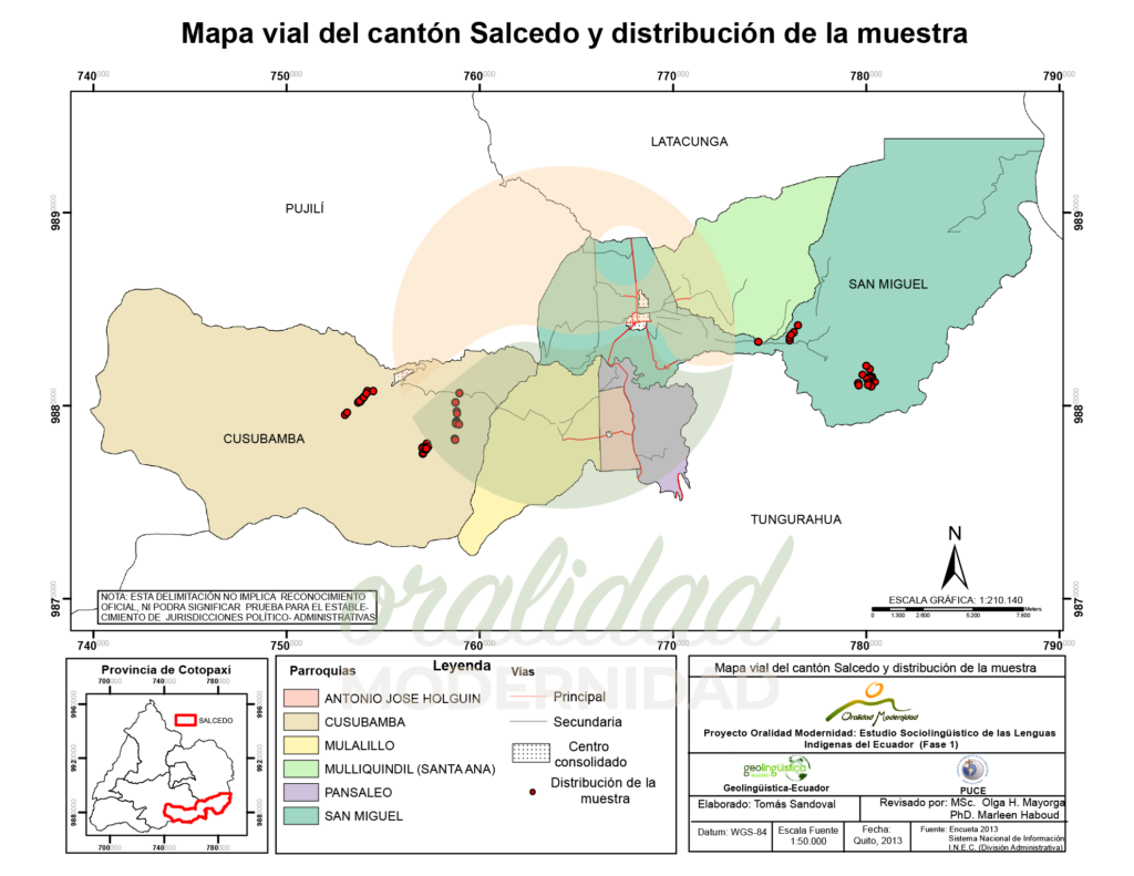 Cite: Haboud, M. (2013). Mapa de representación de la lengua usada por los jóvenes según los habitantes encuestados en el cantón Salcedo. Programa Oralidad Modernidad/GeolingüísticaEcuador. https://oralidadmodernidad.org/cartografia-salcedo/