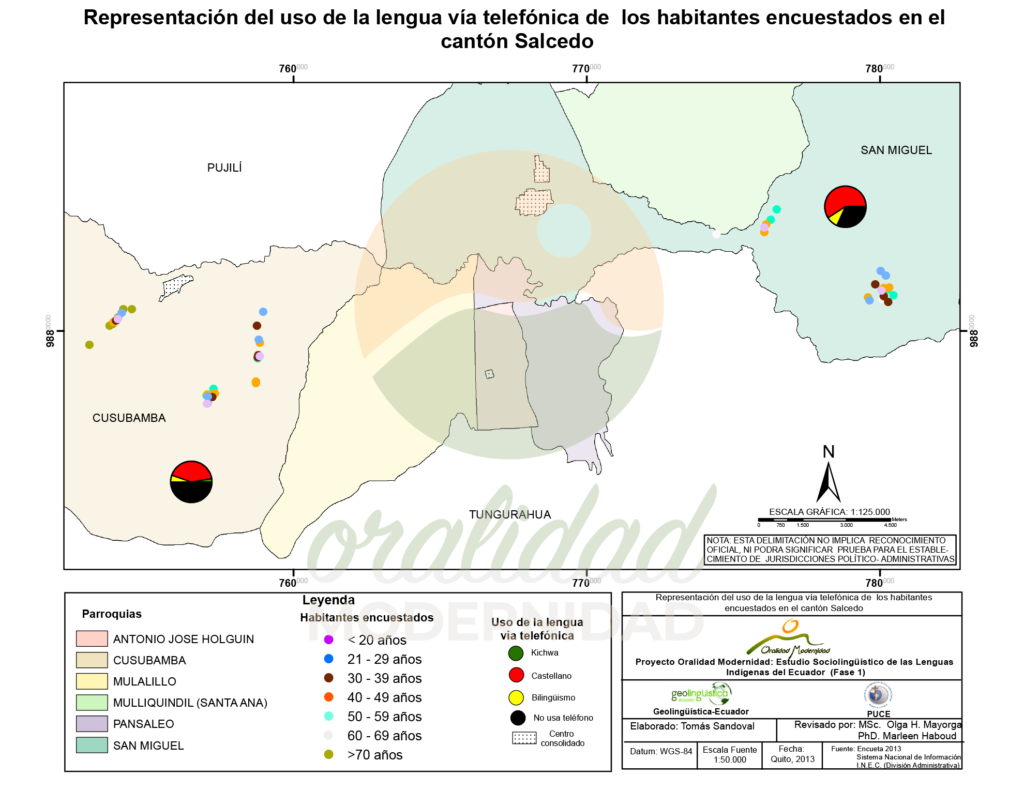 Cite: Haboud, M. (2013). Mapa de representación del uso de la lengua vía telefónica de los habitantes encuestados en el cantón Salcedo. Programa Oralidad Modernidad/GeolingüísticaEcuador. https://oralidadmodernidad.org/cartografia-salcedo/