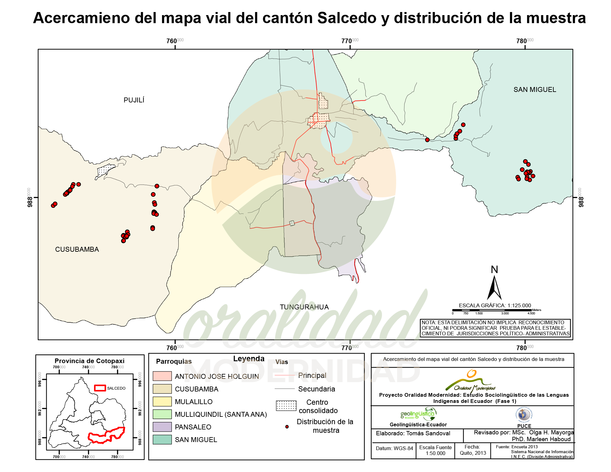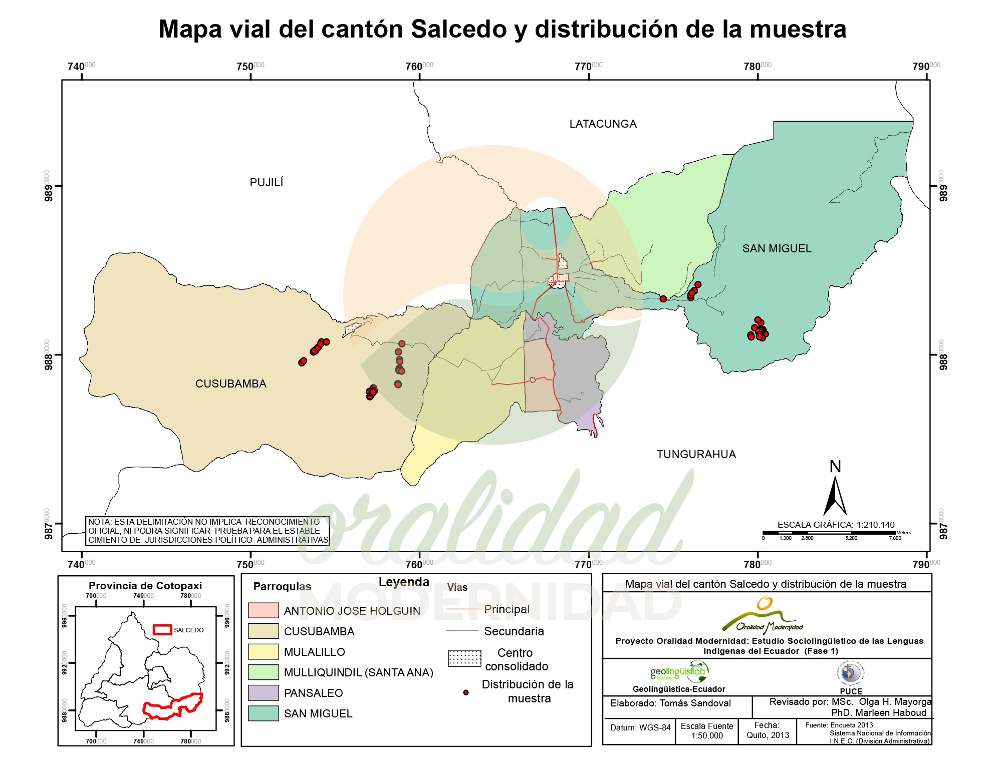 Cite: Haboud, M. (2013). Mapa vial del cantón Salcedo y distribución de la muestra. Programa Oralidad Modernidad/GeolingüísticaEcuador. https://oralidadmodernidad.org/cartografia-salcedo/
